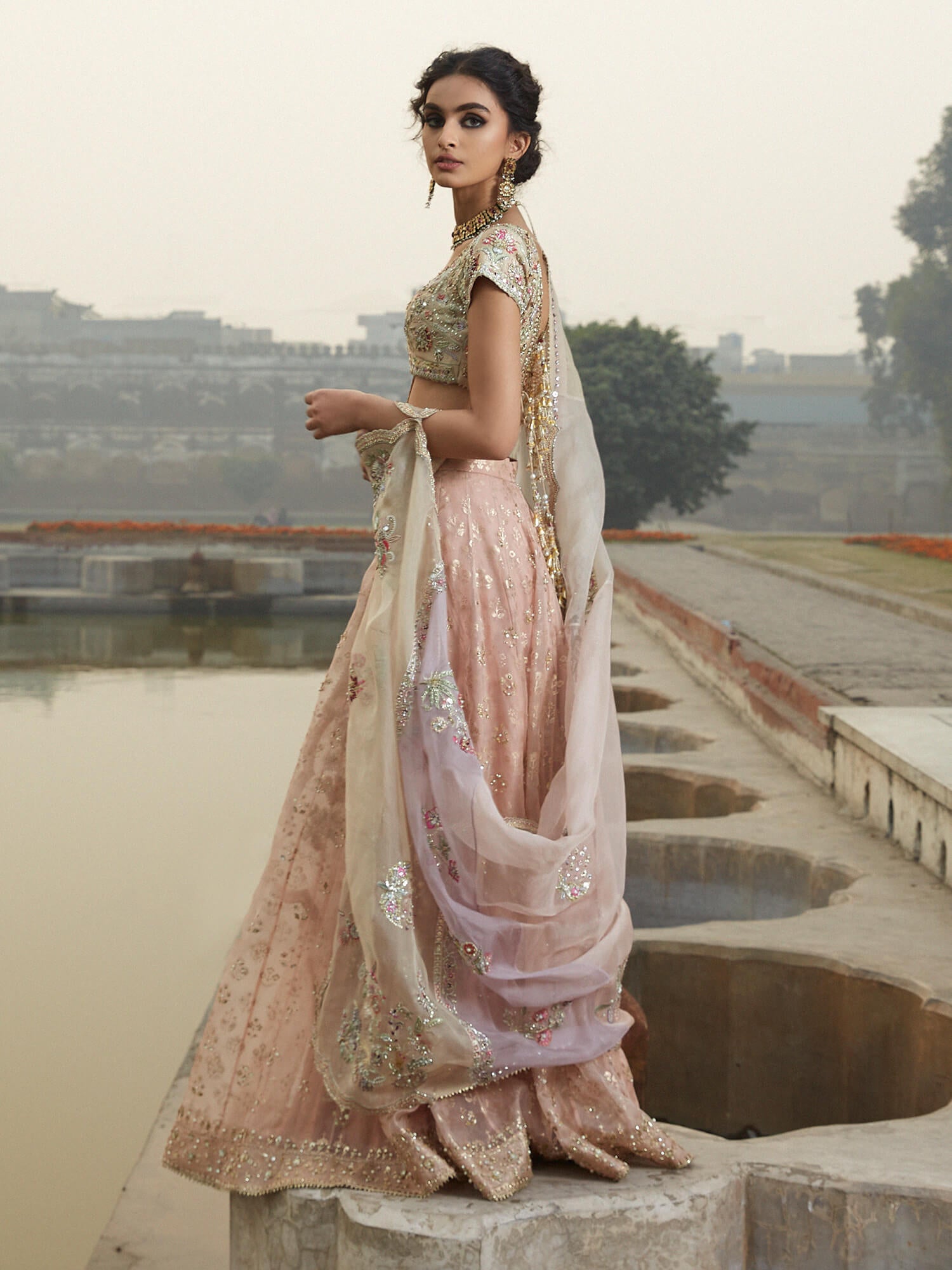 A perfect blend of old-world charm and new-age sensibilities. This lehenga choli features intricately handcrafted zardozi and resham accents and comes with a beautifully worked color-blocked organza dupatta with thoughtfully placed scallops and handcrafted accents.