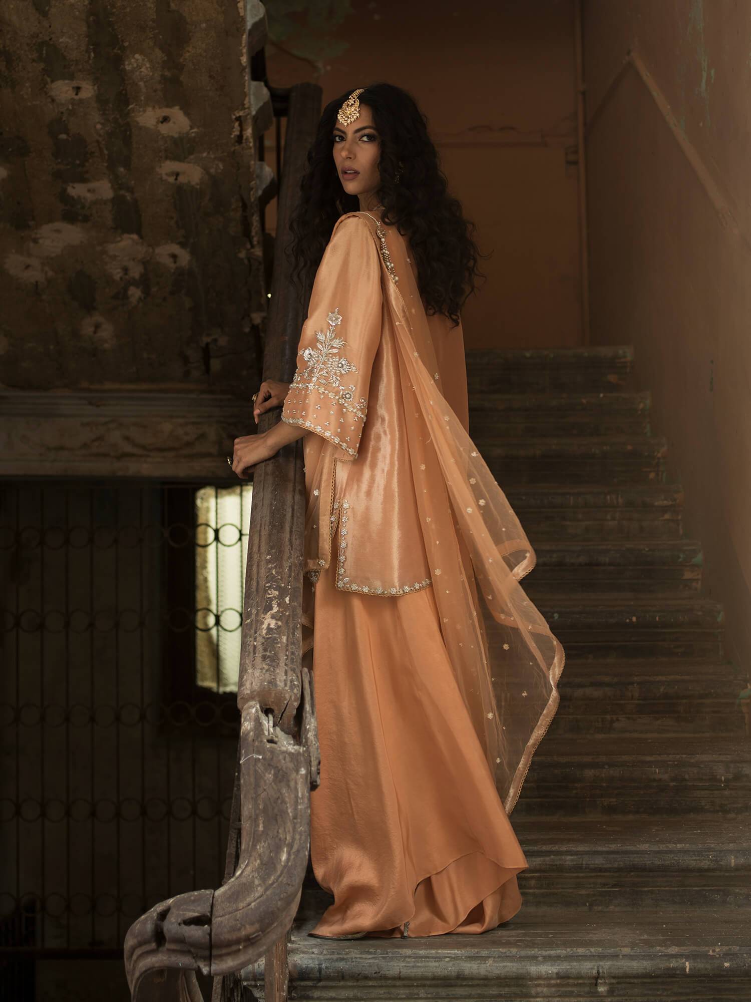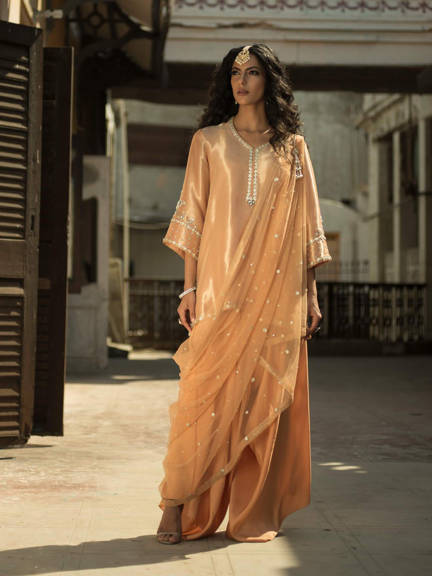 Shine brighter in this easy-festive piece that brings back an old-world elegance, featuring beautiful zardosi jewelled hand-embroidery. It comes with bias-cut loose pants and a draped dupatta for a richly layered effortless look. Parts can be worn separately for a more dressed-down look.