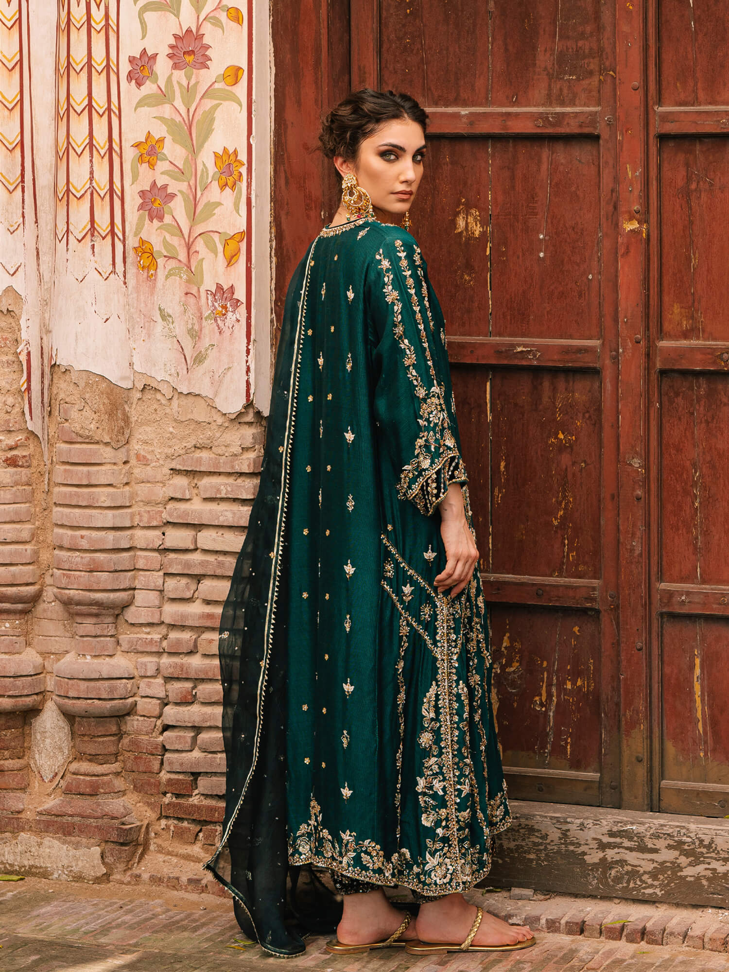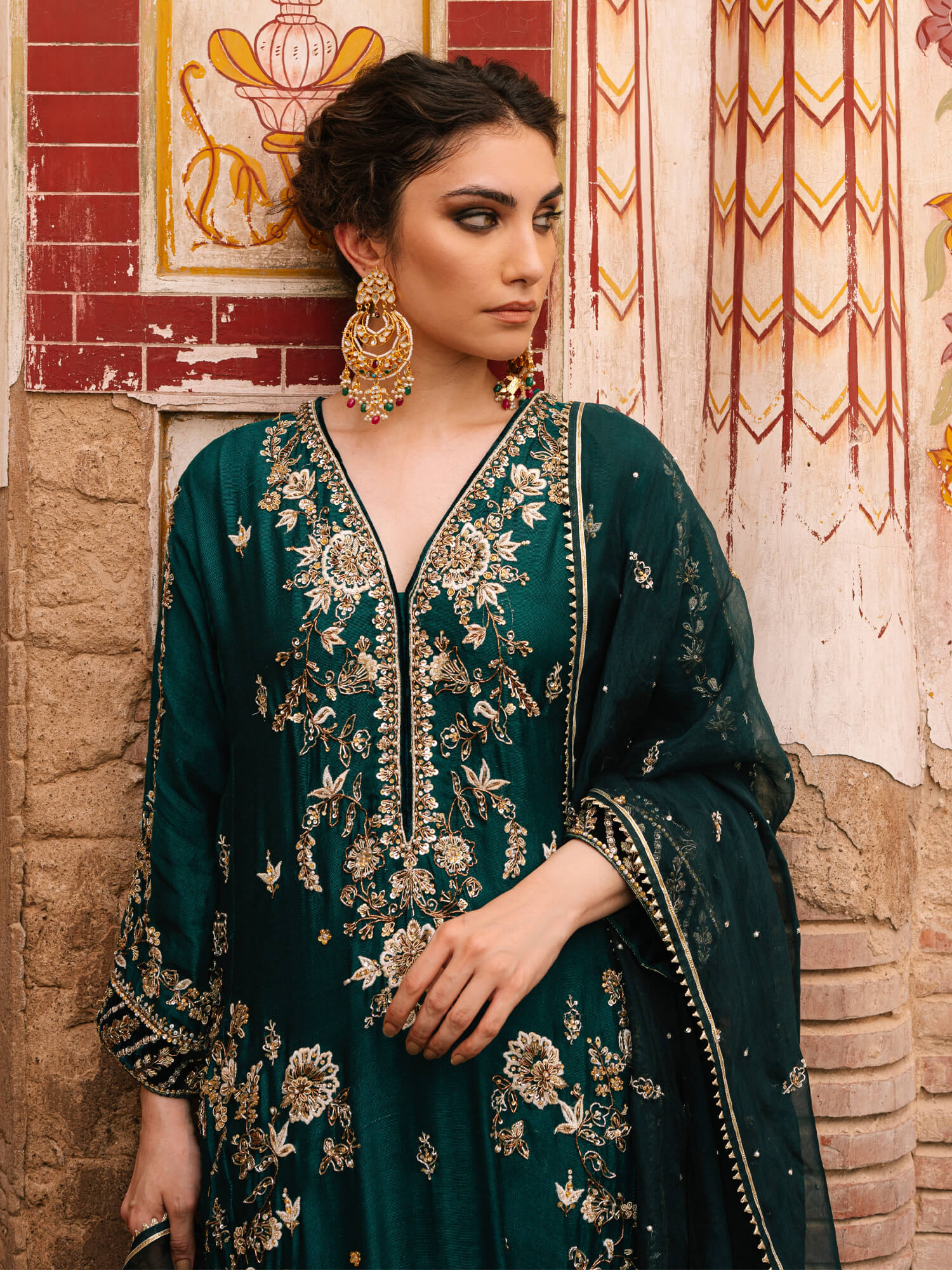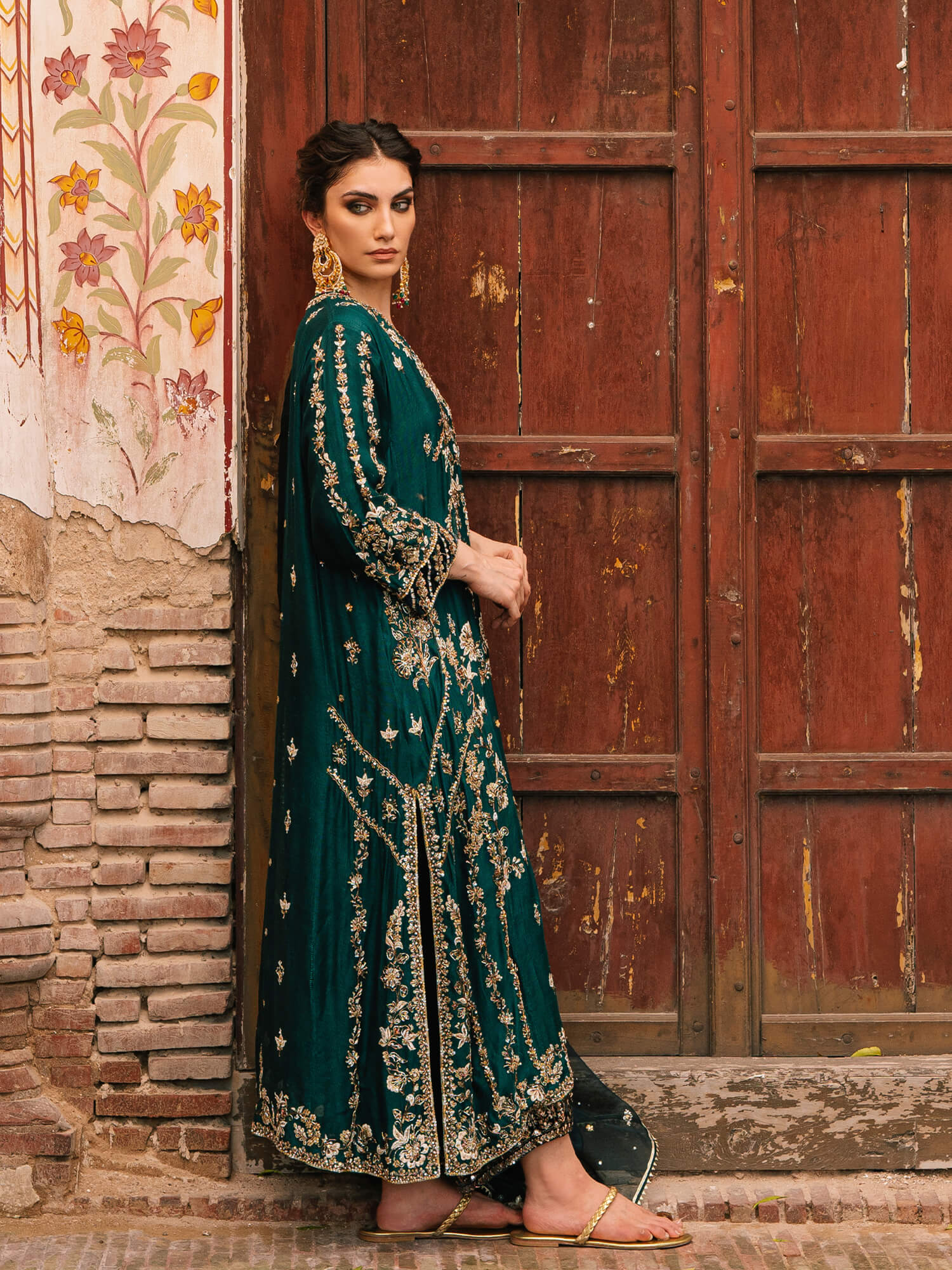 A twist on a favourite silhouette, the Nimr kurta is made of spun net and features embroidered details with handcrafted accents. This versatile classic comes with beautifully crafted gossamer organza dupatta and will take you through years of evening engagements in style.