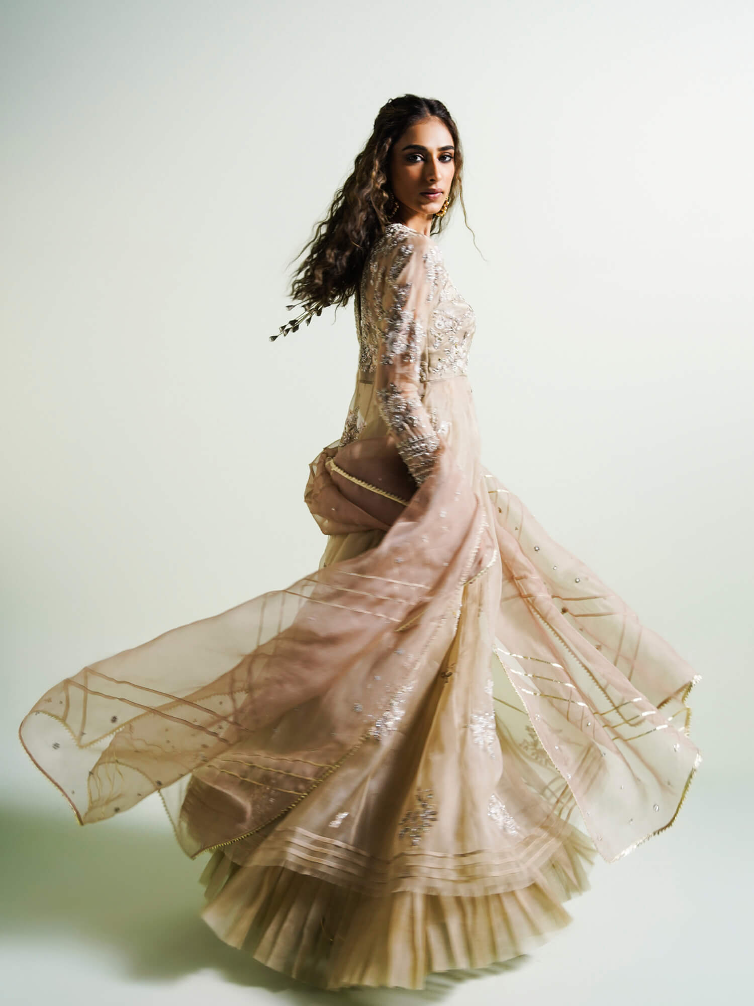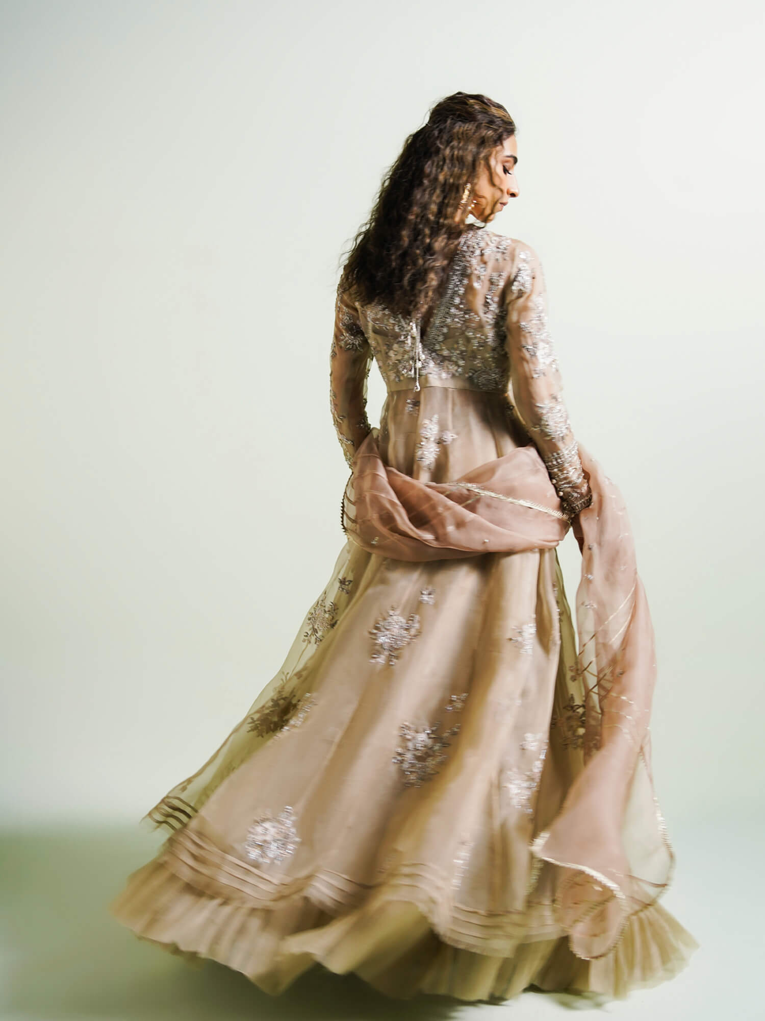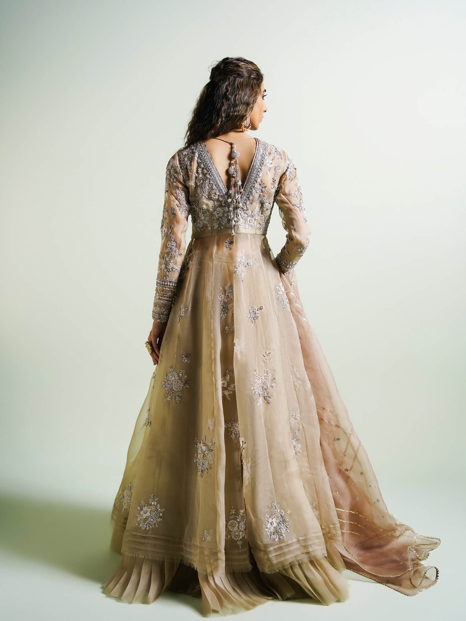 This dreamy organza Sufi features, floral bunches using resham embroidery, handcrafted accents, and gota embroidery. It comes with a seamless organza lehenga, with fan pleats on the hemline, and a crafted organza dupatta. The Sufi is a versatile piece that is perfect for many celebratory occasions.