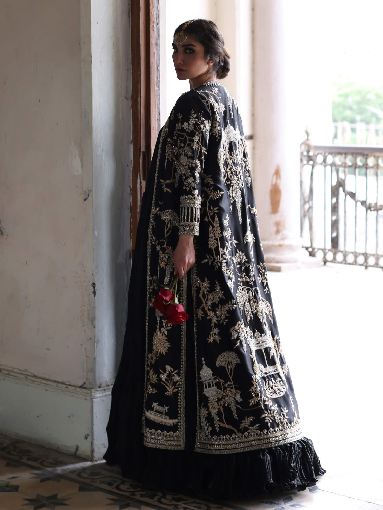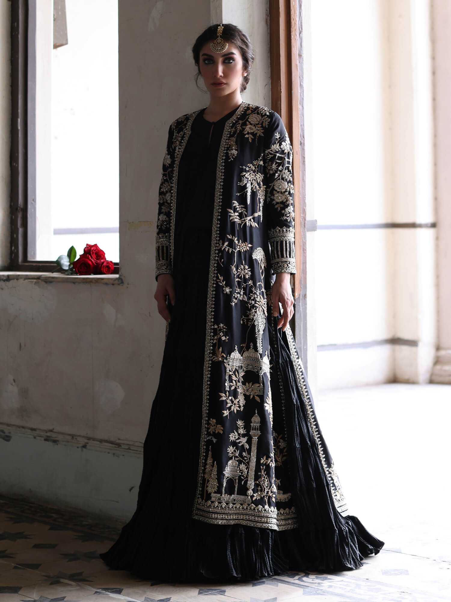 Carefully crafted Mughal architecture, flora and fauna takes centre stage on our richly black embroidered Borgia coat. It comes with a slip and pants, although it is styled here with a crushed Anarkali.