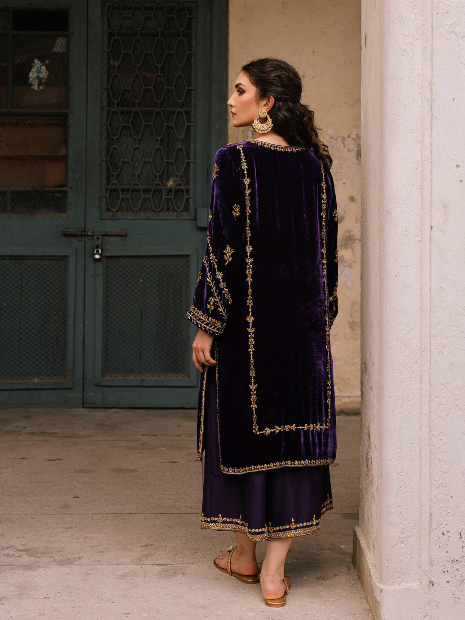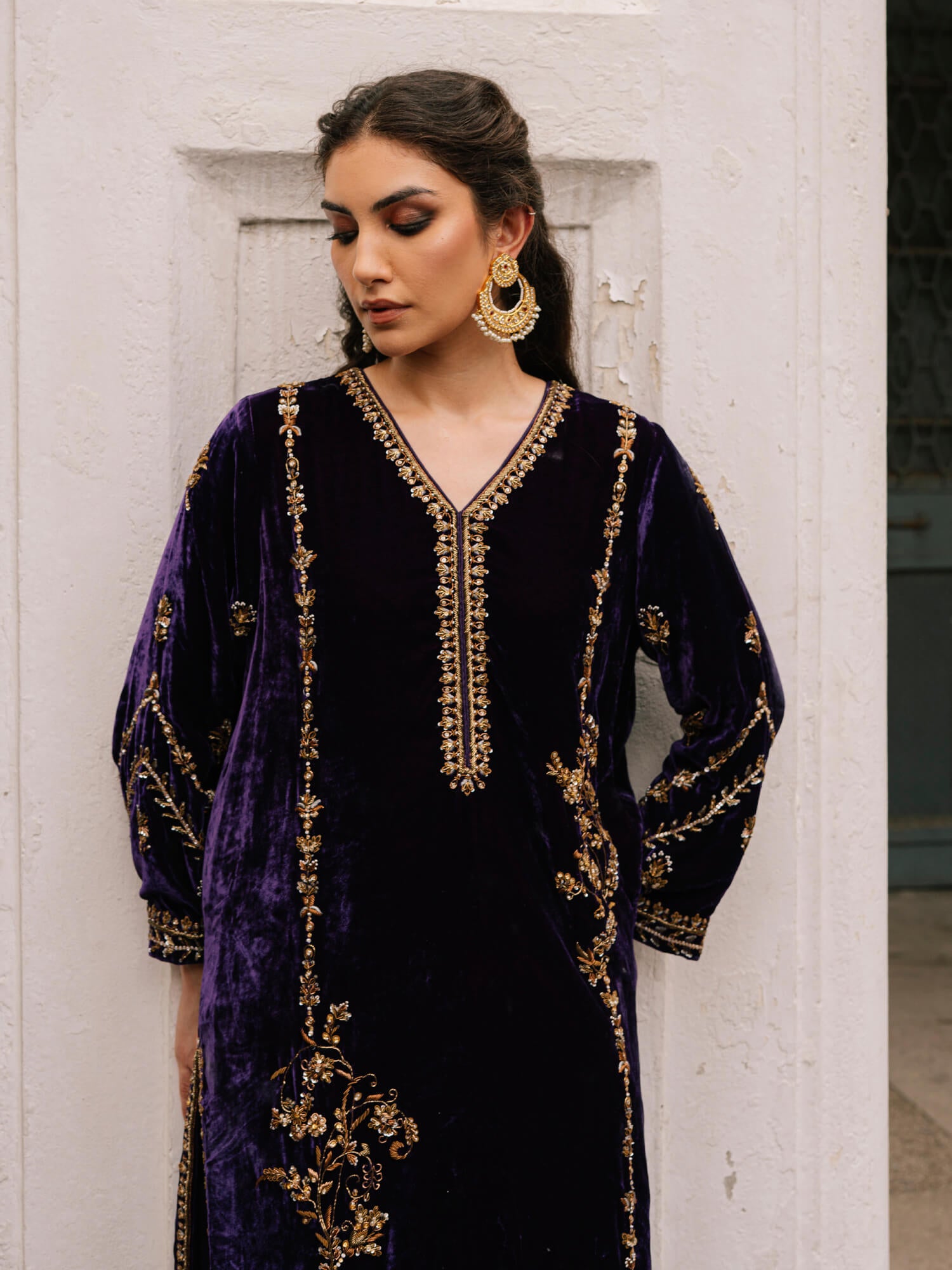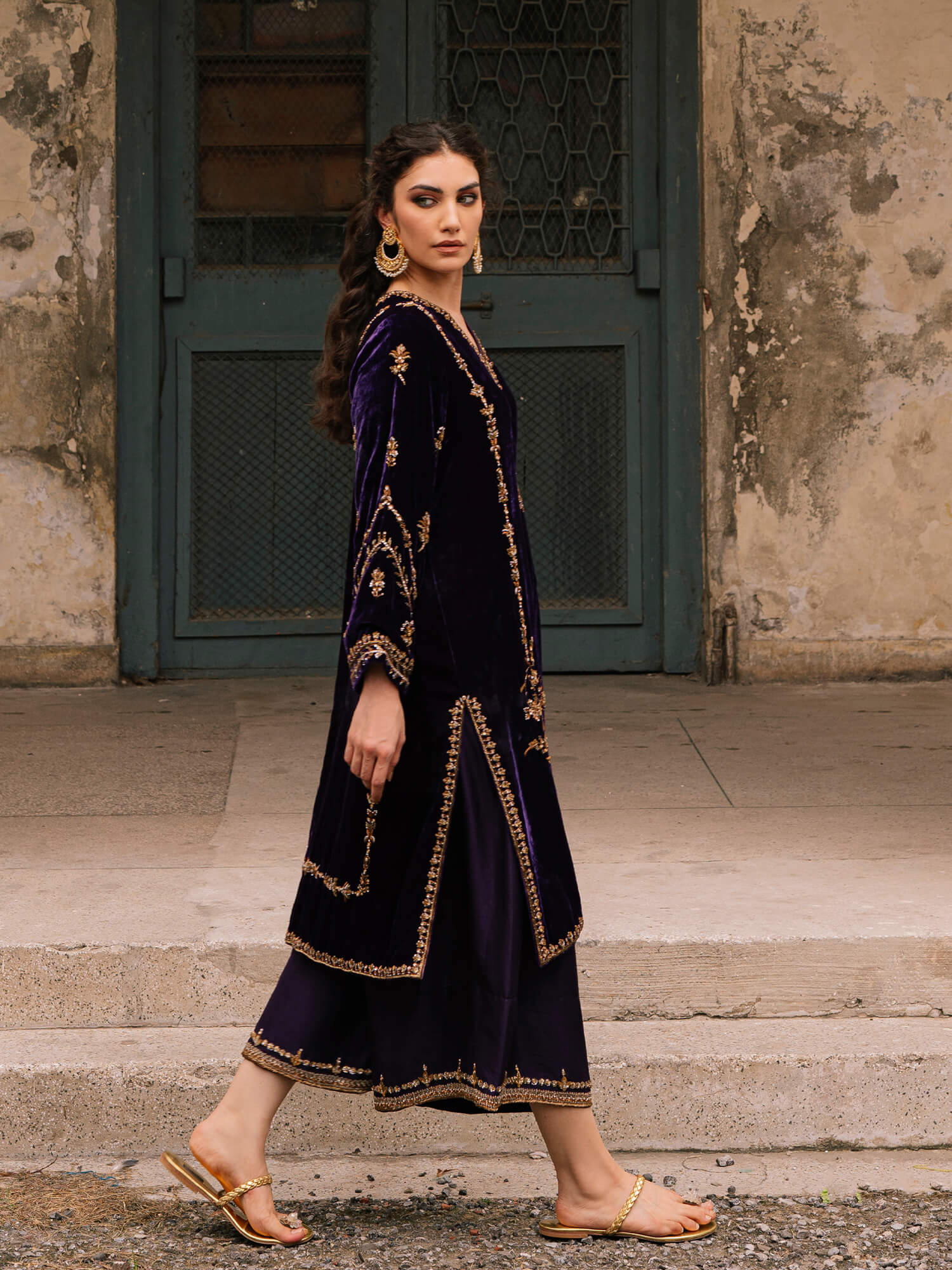 A polished look that involves minimal effort. This midnight blue Alisha set features antique zardozi all over. It is paired with crafted velvet culottes for effortless elegance.
