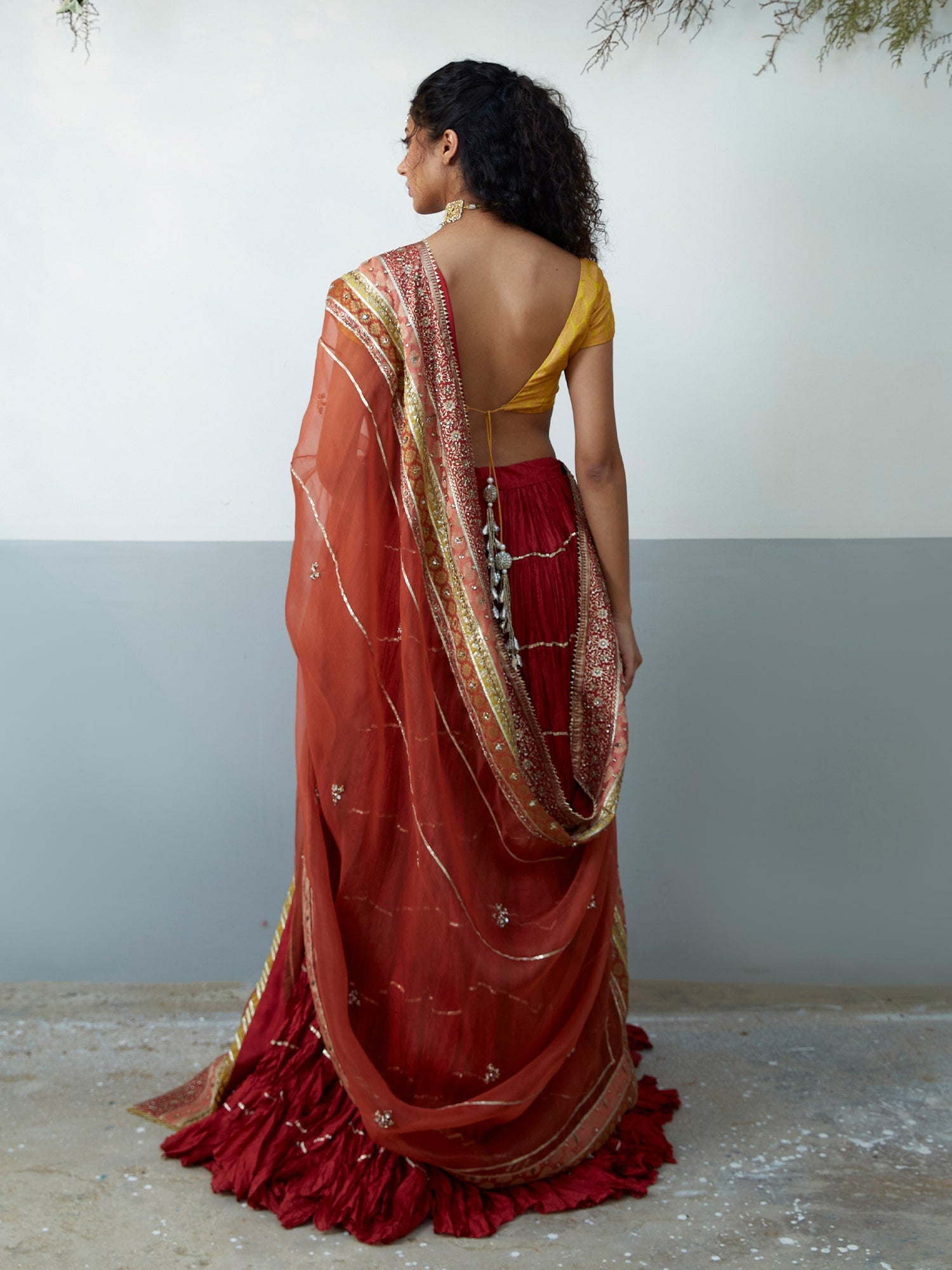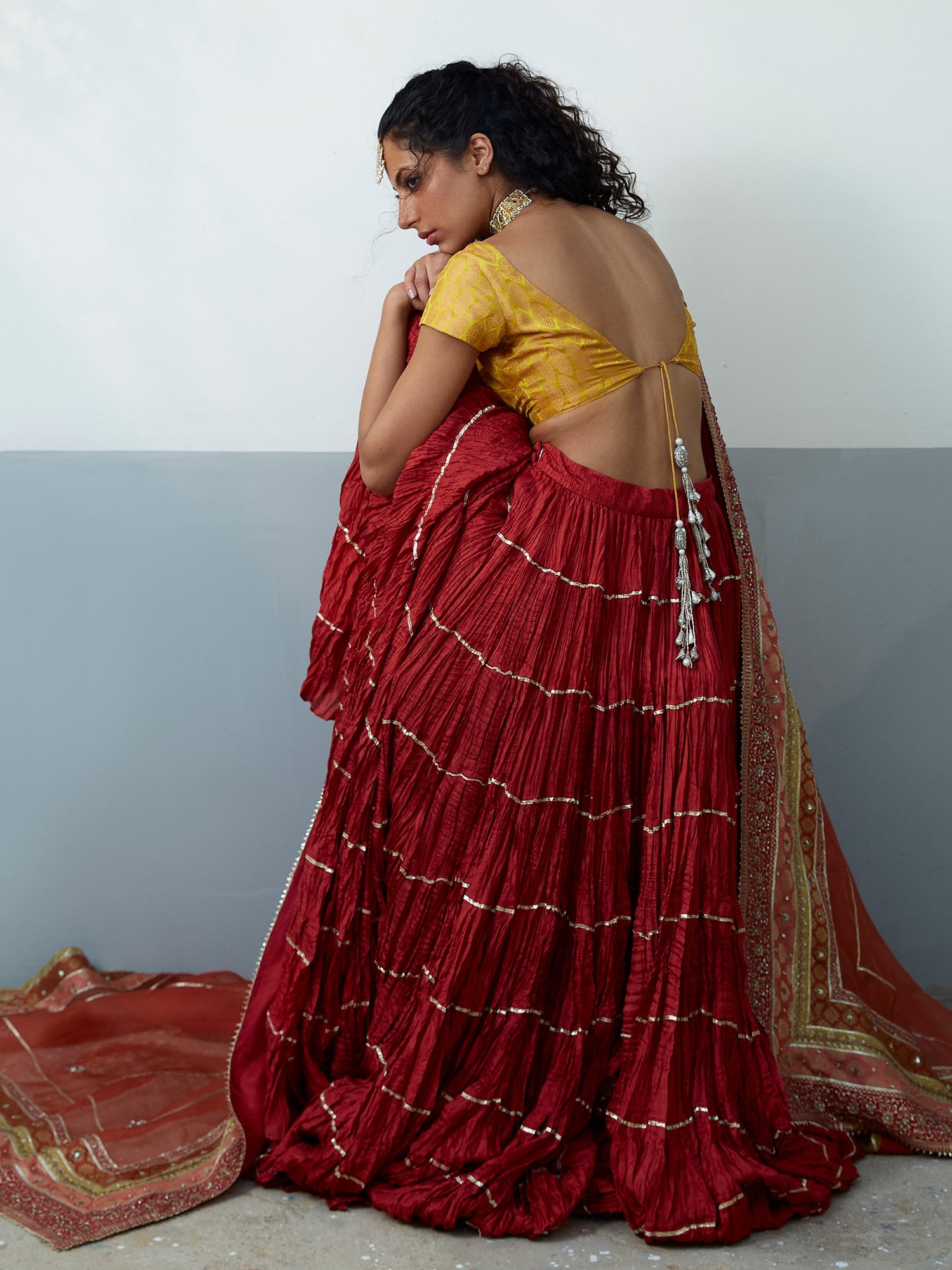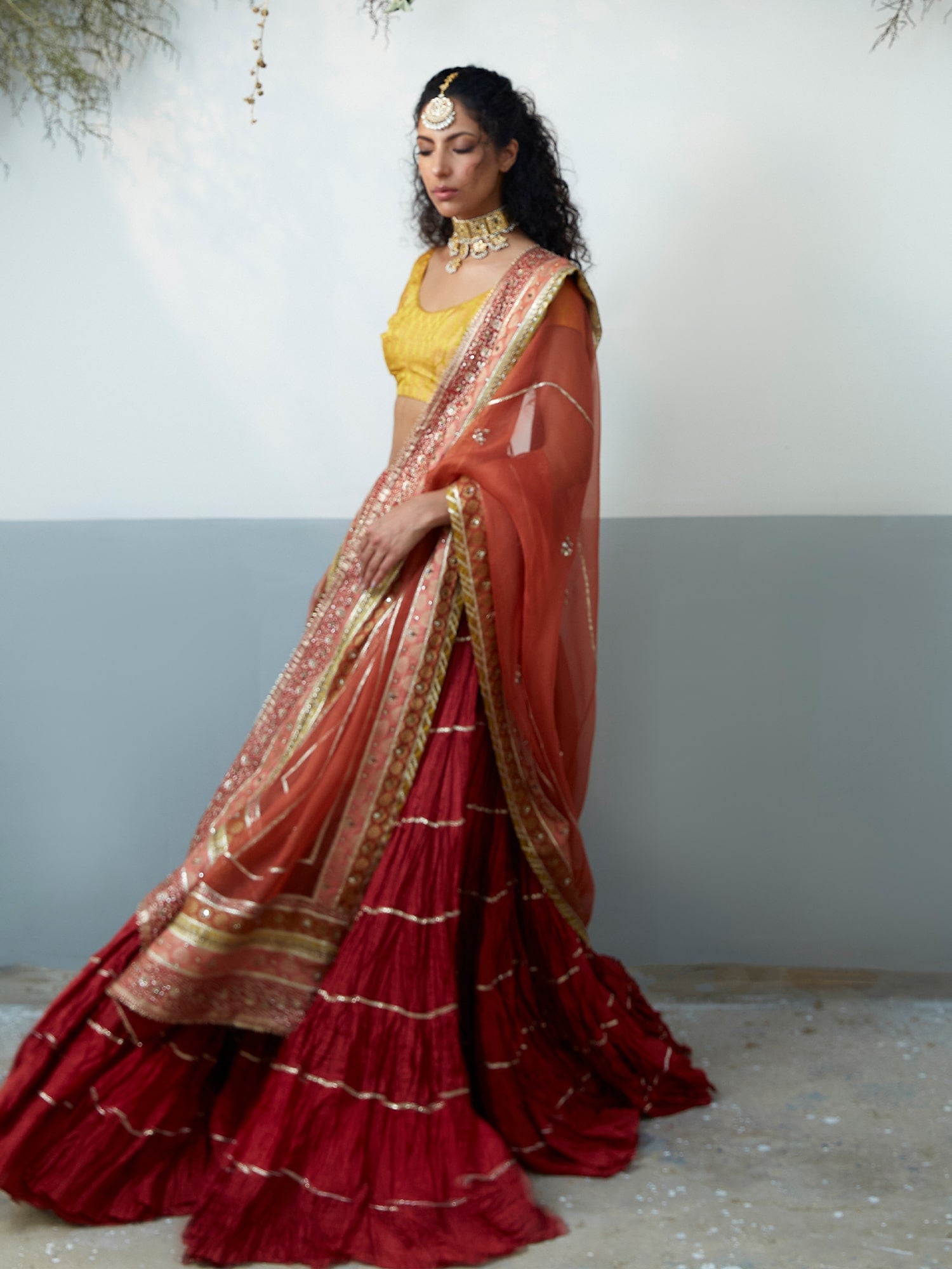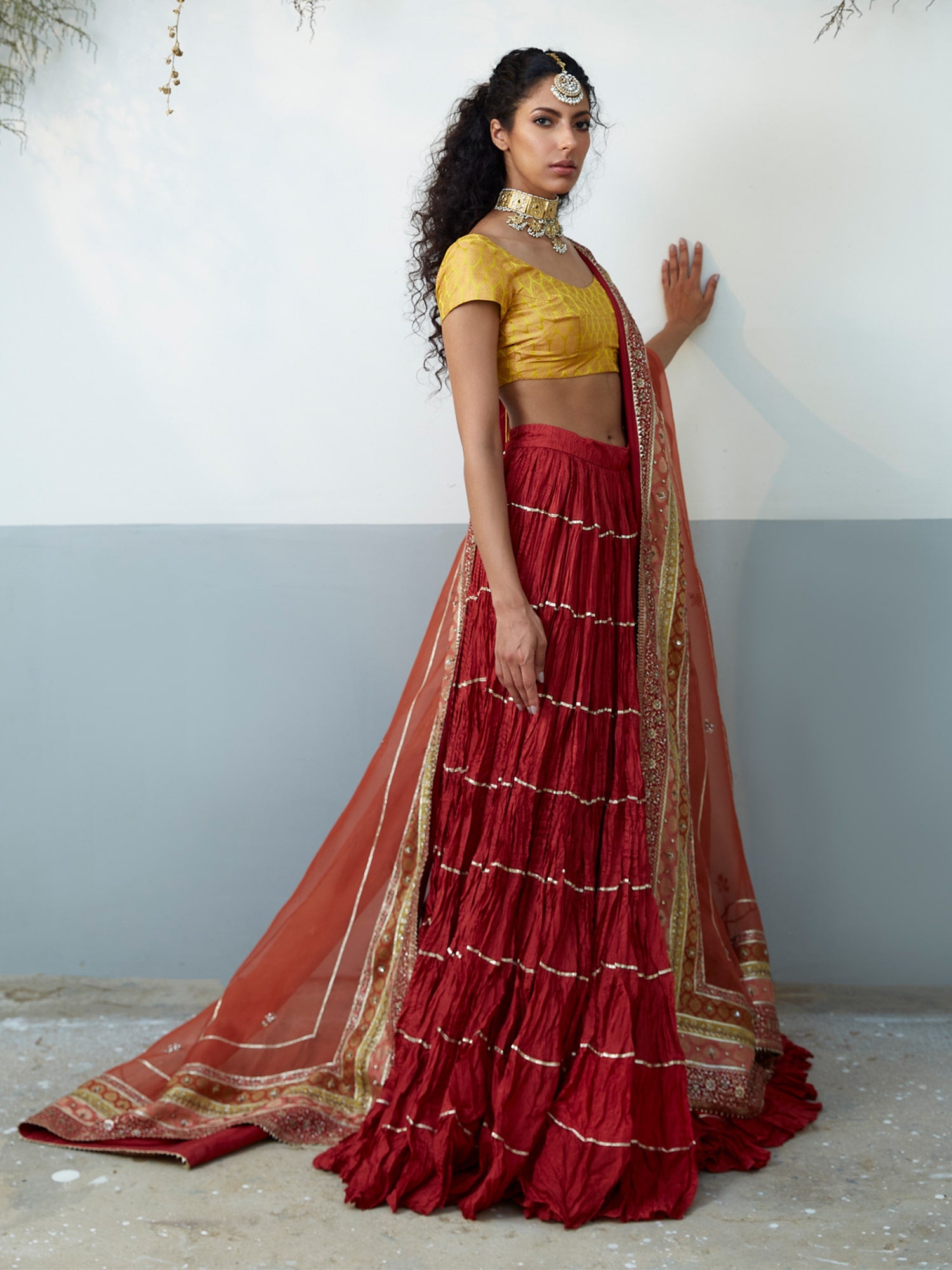 This eclectic choli is beautifully paired with our crushed lehenga with gota accents. It comes with a dreamy dupatta saturated with zardozi, resham, gota work and intricate borders on its organza dupatta, featuring a mix of foil and brocade work with zardozi, and gota elements.
