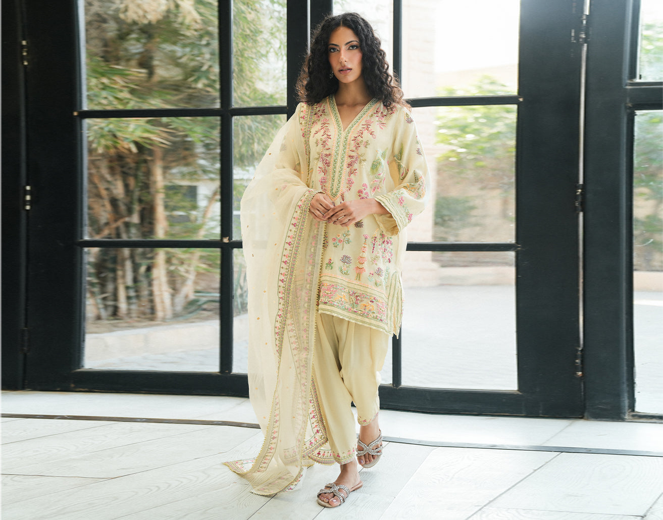 Cut from raw silk, the Alisha set reinvents a classic silhouette featuring a traditional short kurta paired with our signature draped dupatta and free flowing pants. It showcases print with fine embroidery and zardozi work inspired by chintz motifs. This versatile piece is effortlessly adaptable for any occasion.