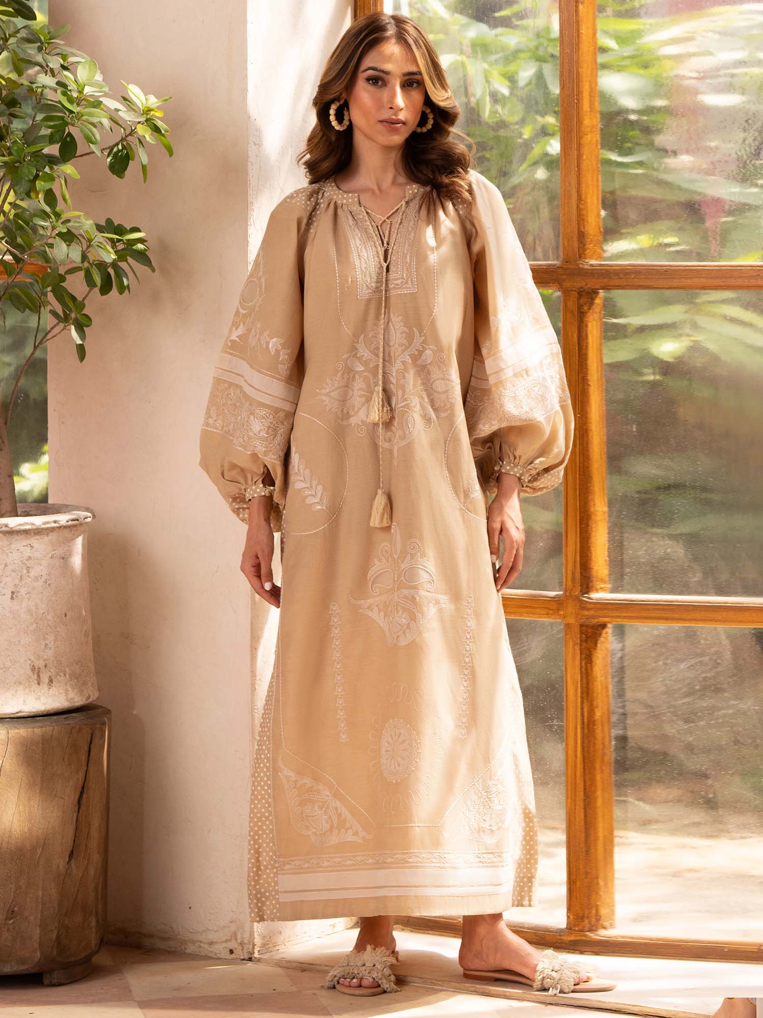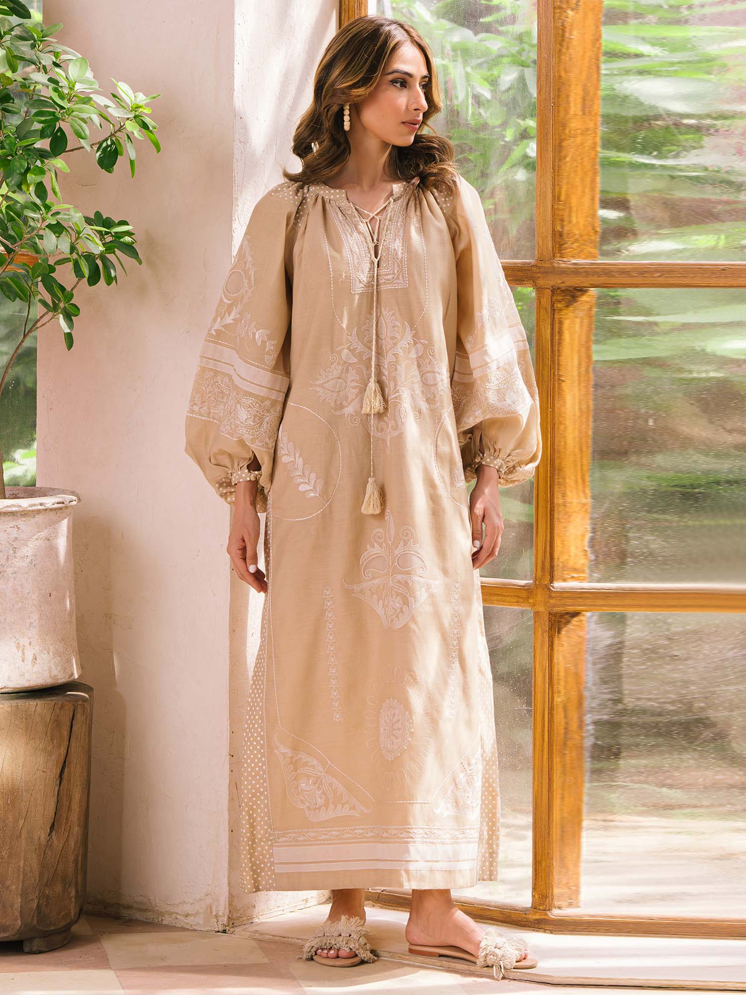 Buy now, love forever. Our sand Anhar showcases fine print and resham embroidery in ivory hue and inspired by Uzbeki and suzani art motifs. It is further elevated with crafted tassels. It can easily be dressed up or down for all your summer dalliances.