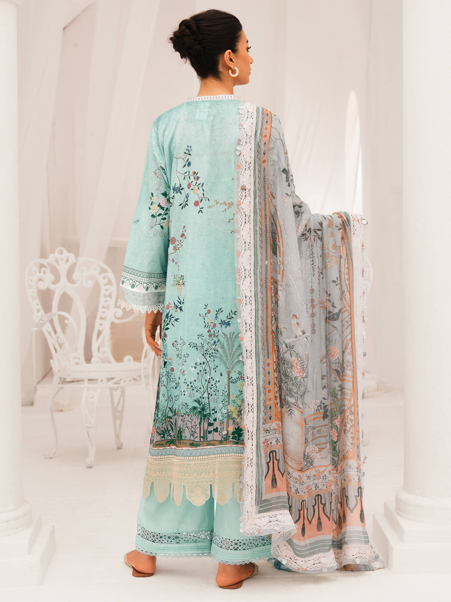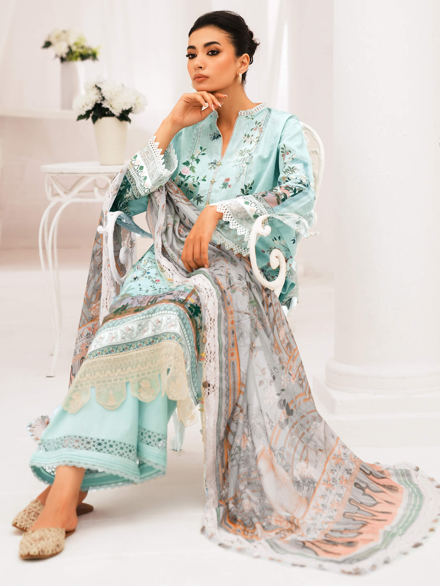 Inspired by chinoiserie florals, “Ankara” is composed on a sky blue printed canvas with elegantly detailed organza borders and is paired with a matching diaphanous silk dupatta. Sure to be favourite for all your summer soirees.