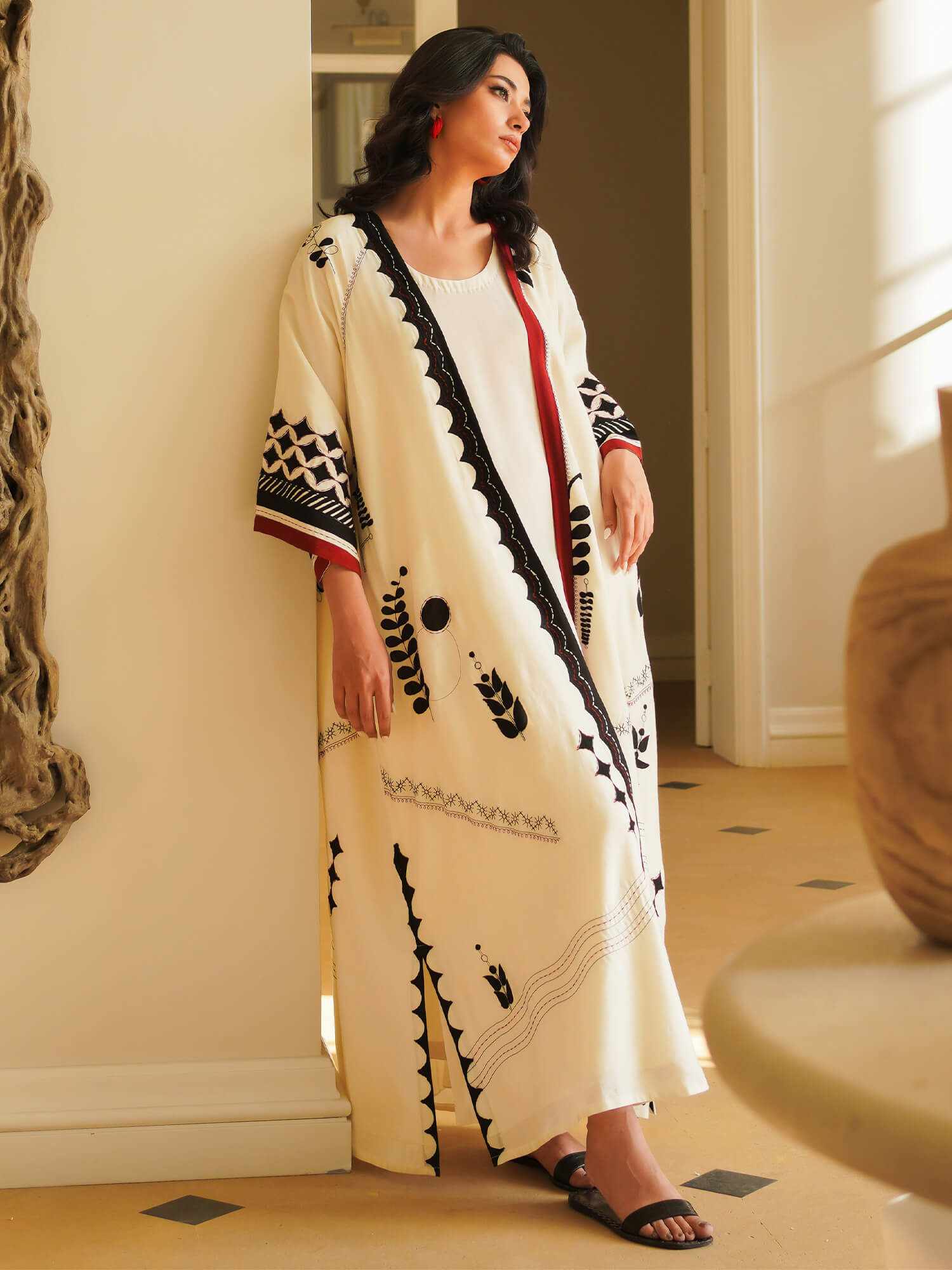 Reimaging the old with the new, the Anoud is a fresh take on the traditional abaya. Cut from khaddi silk, it features black and red hue applique geometric motifs. It’s styled with a matching slip for an effortless look, as seen here.