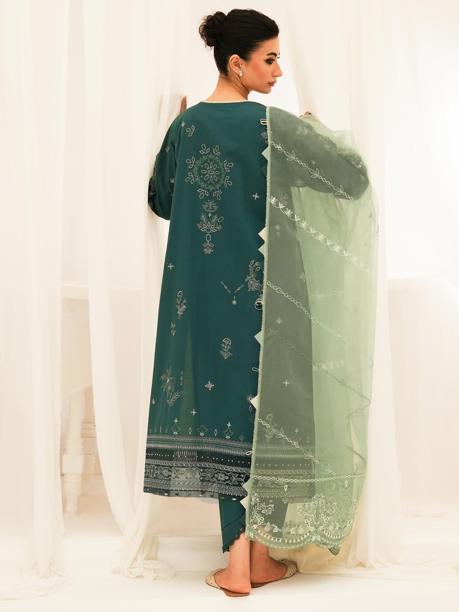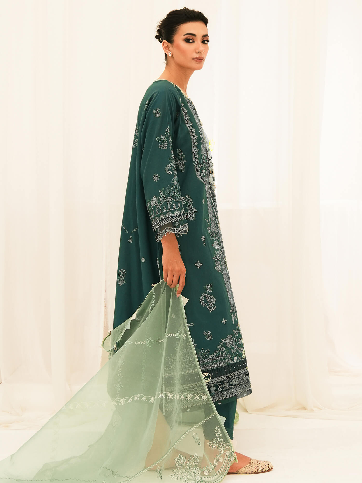 Crafted on a jade green base, "Antalya" features fine embroidery set against a mint green gossamer organza dupatta, beautifully embroidered with scallop borders on the pallu, adding effortless elegance to the ensemble.