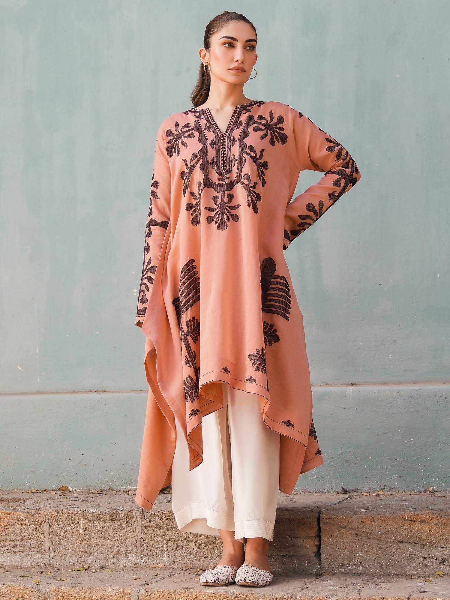 Our Bandra kurta in salmon coral is perfect for your year-round wardrobe. It features fine embroidered abstract palm-florals inspired by folk quilts motifs. Style it with our ivory izaar, as seen here.