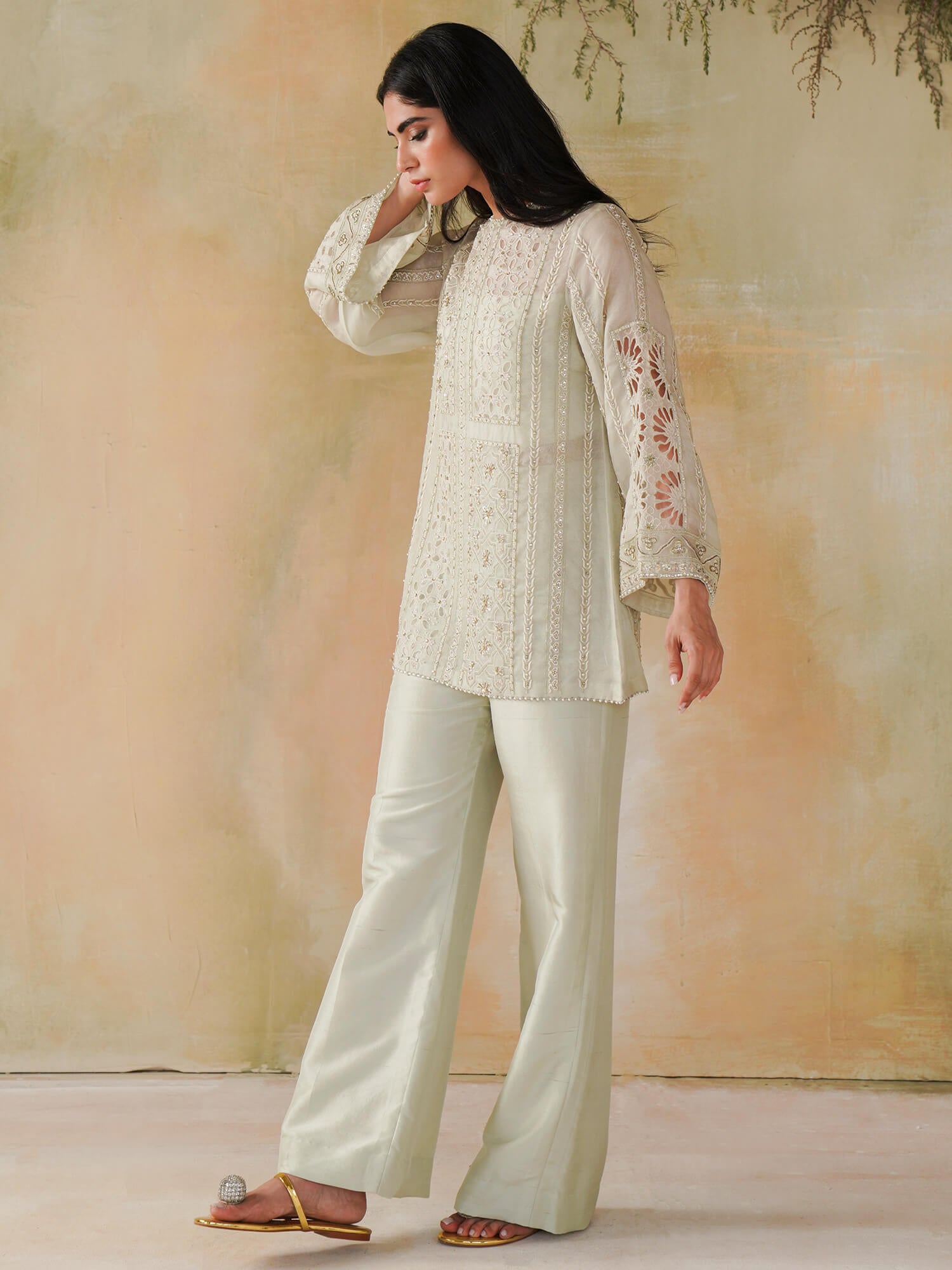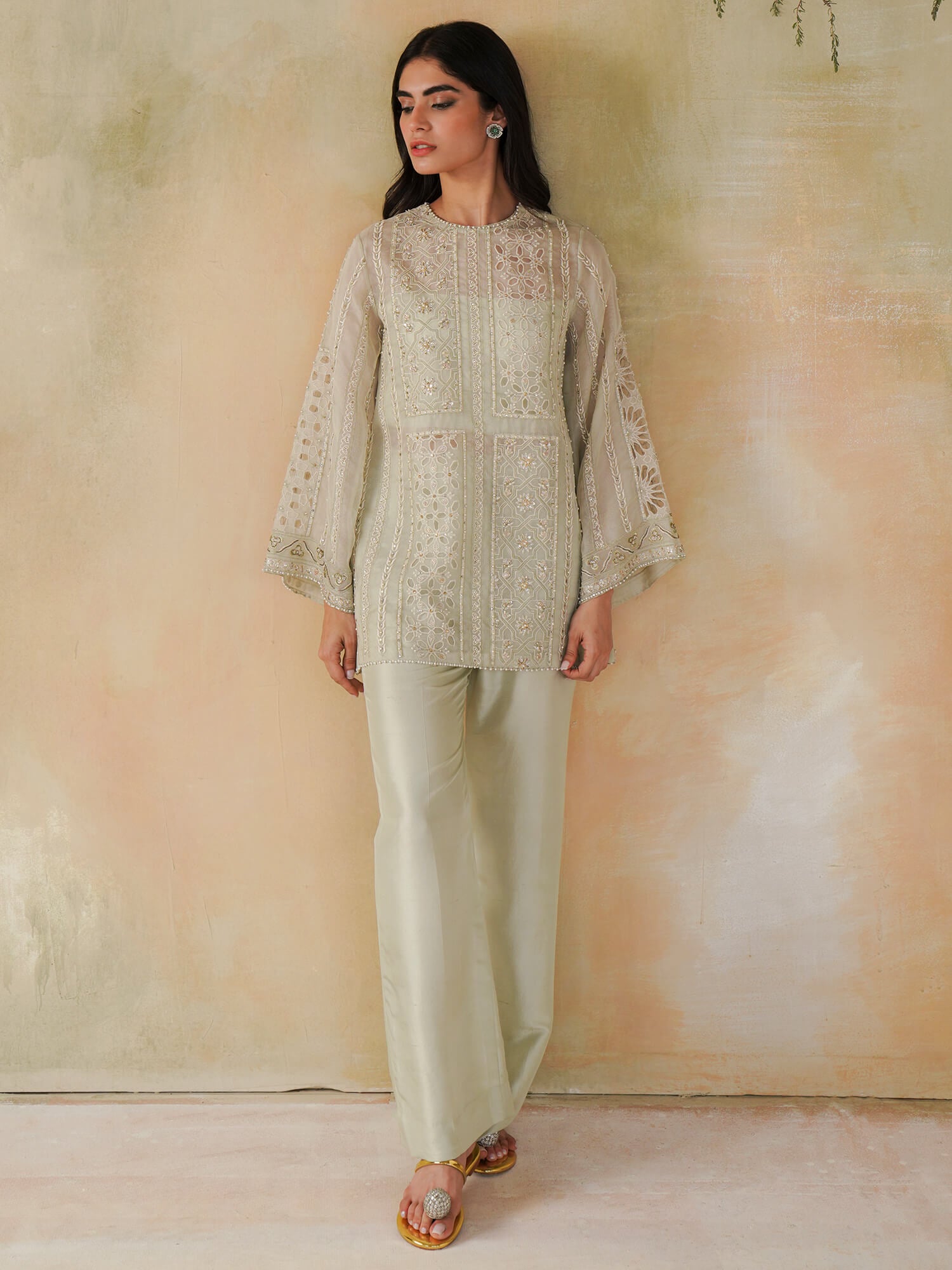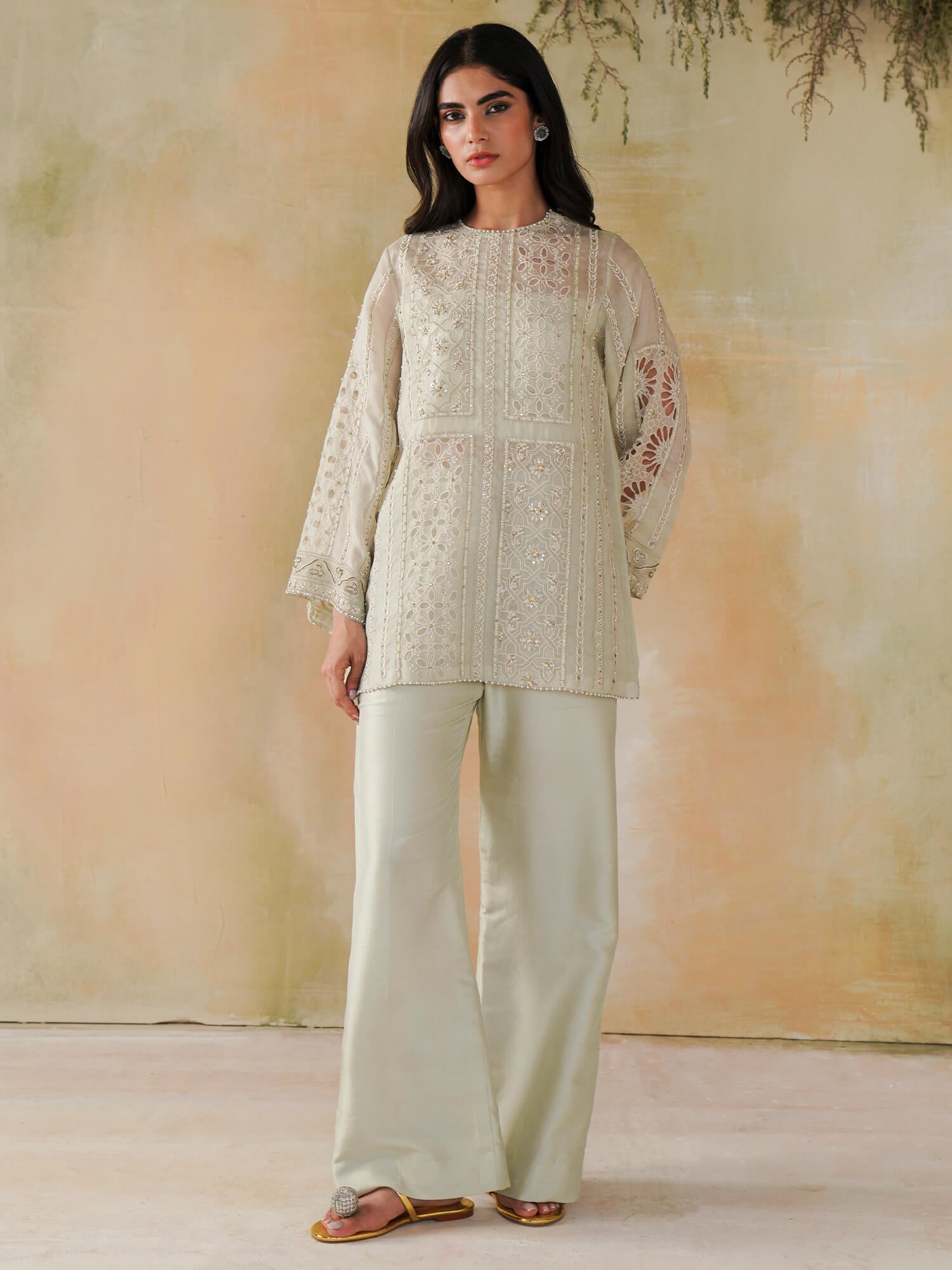 Cut from aqua blue organza, the bell sleeve top features delicate cutwork enhanced by resham and jeweled embellishments. Paired with a bandeau and matching tapered culottes crafted from rawsilk, perfect outfit for daytime soirees.