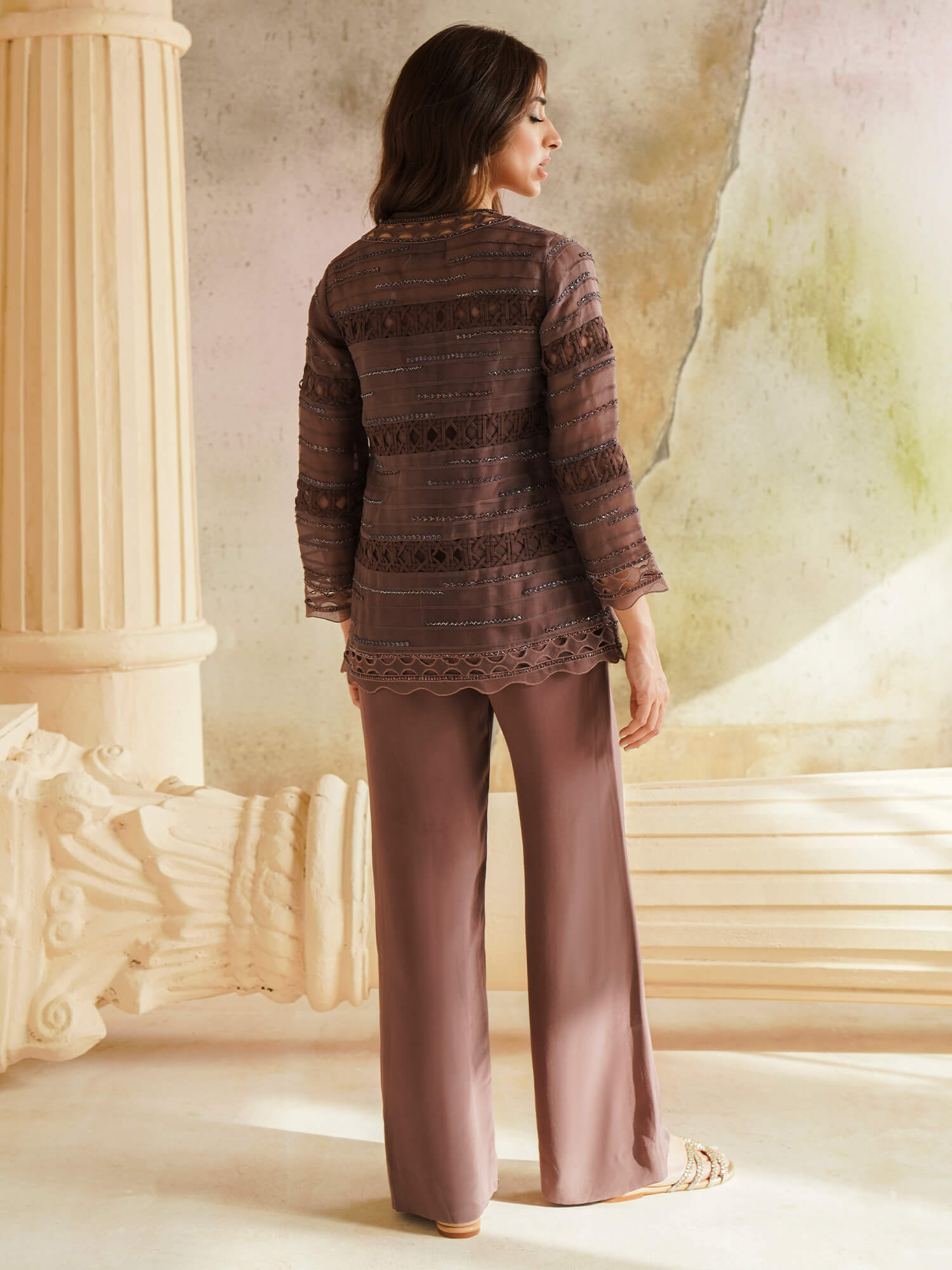 Embrace easy-going elegance this season in our purple grape Borgia coat, featuring self-on-self jeweled embellishments and cutwork on the sleeves and daman. Tailored to perfection for all your evening soirées, its paired with matching tapered trousers for a more defined look.