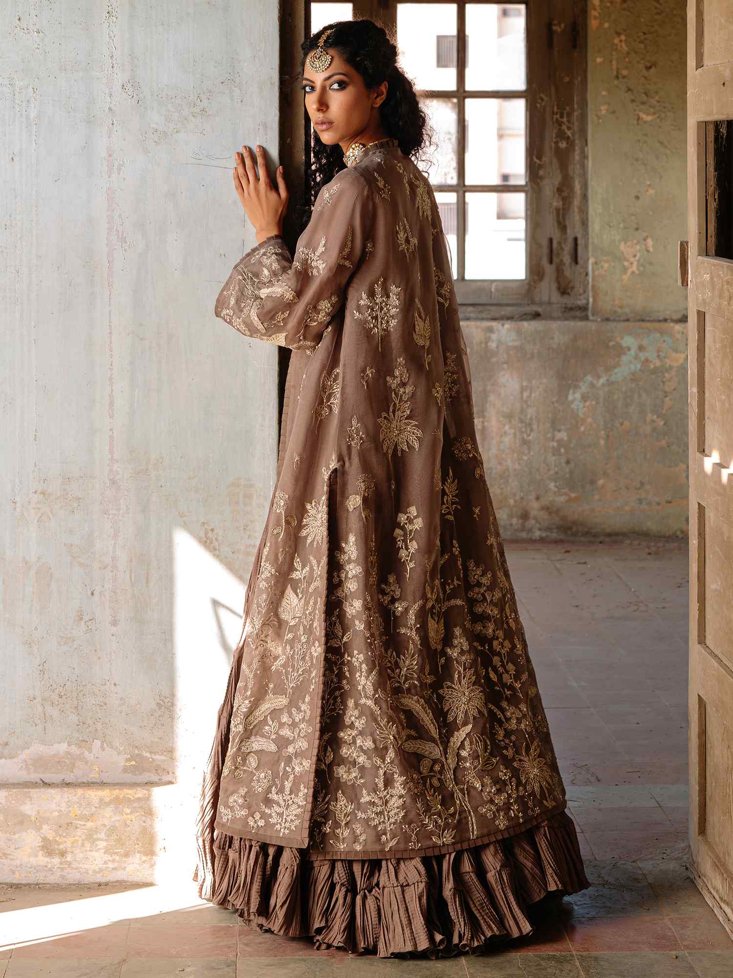 This Borgia coat is an instant head-turner featuring flared sleeves and a myriad of techniques such as floral resham, zardozi, pitta and naqshi work. The floral cutwork blouse has a cross back and is styled here with our crushed silk ghagra – perfect for moonlit occasions.
