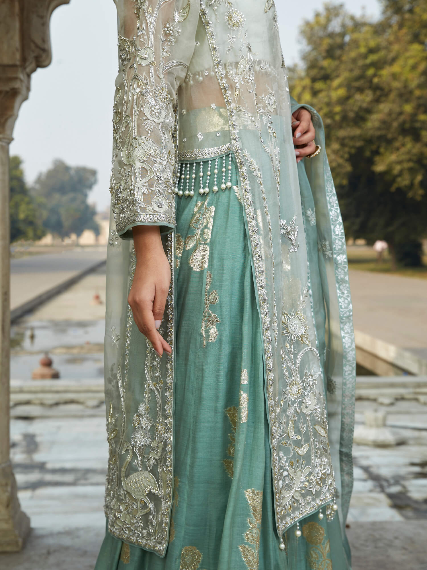 This timeless Bundi features Chintz inspired floral applique work with zardozi work in silver with hints of gold. It is paired with a woven lehenga and a lightly embellished dupatta for all your upcoming wedding festivities.