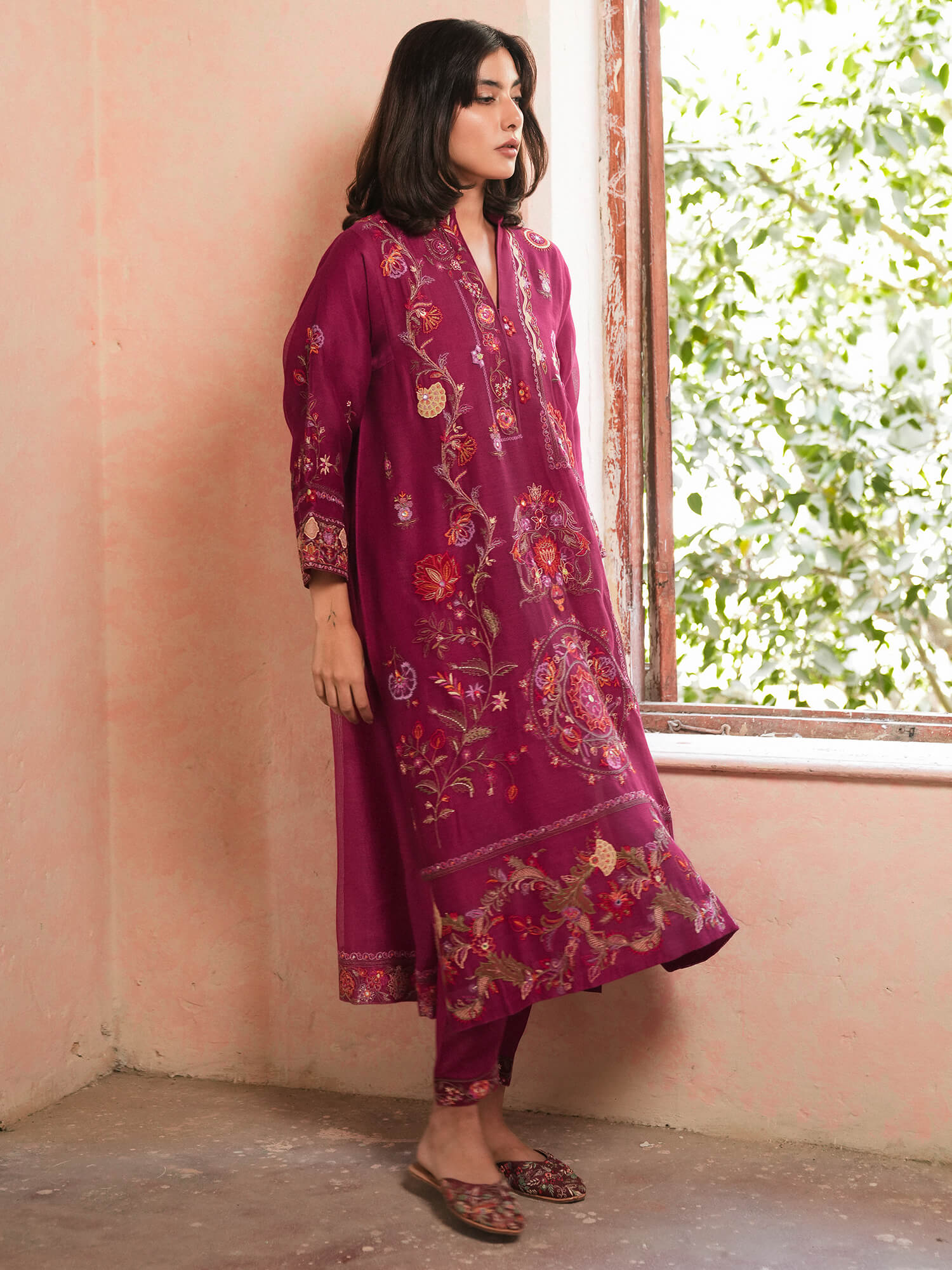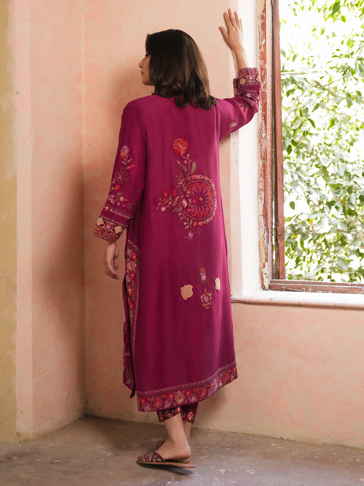The chakor set can be easily dressed up or down for any festive occasion. Inspired by Mughal and iznik motifs, it features fine applique work and aari embroidery in complementing accents. It is paired with a matching crafted skinny shalwar, perfect for all your summer soirees.