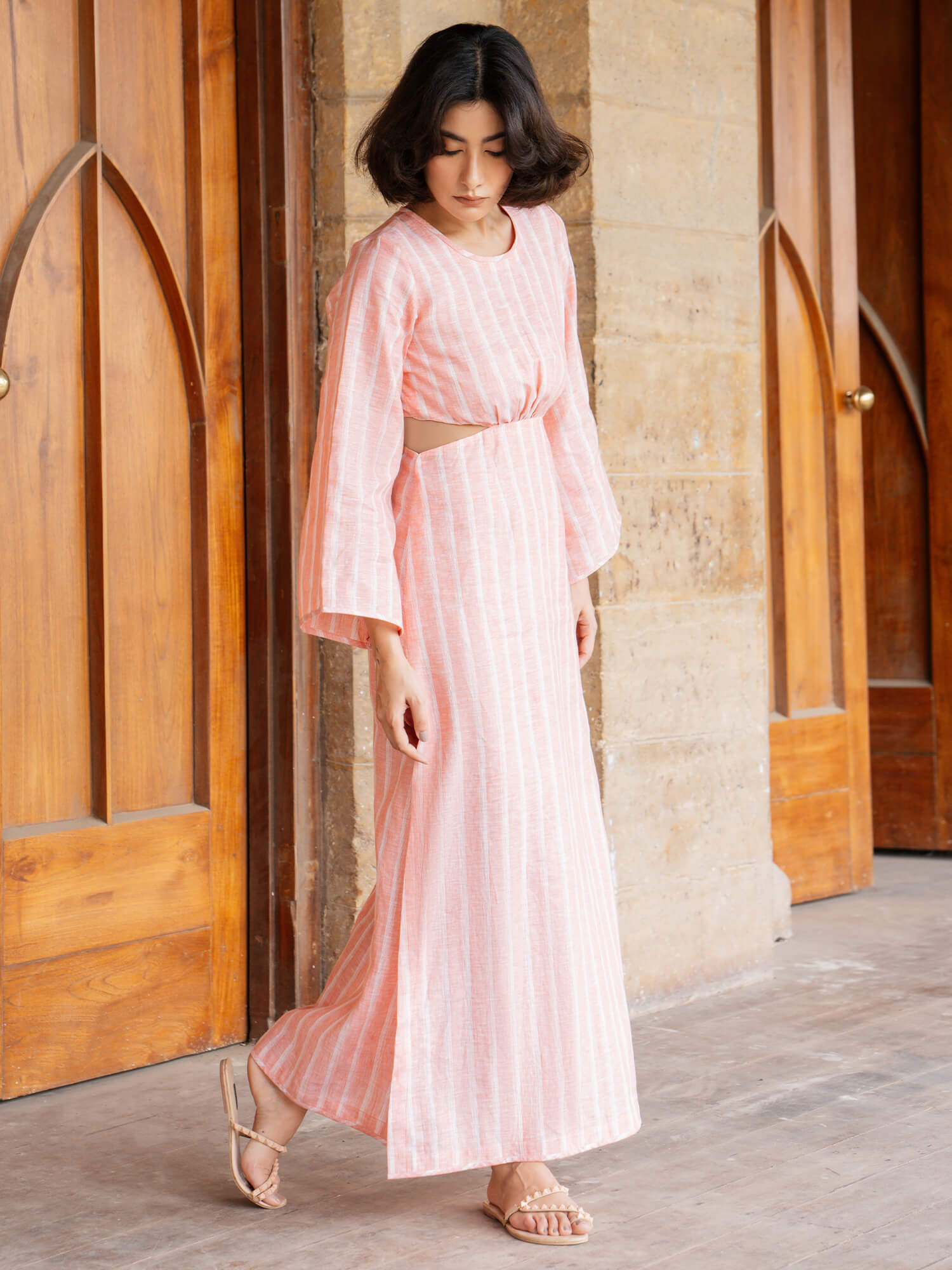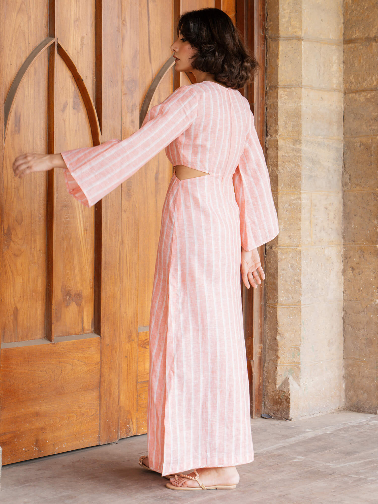 Introducing Coco, an elevated essential for this season. Crafted from woven linen, it features ivory and dusty pink stripes. Dress it up with wedges for an evening soiree or pair it with sandals to exude a more relaxed charm.