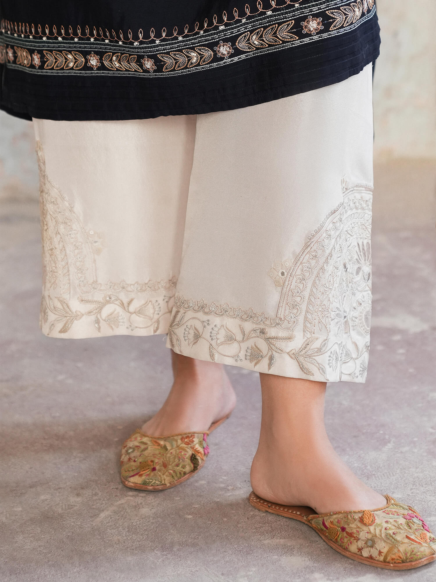 Our timeless izaar features fine embroidered floral and ornamented motifs with minimal silver zari, mirror and floral tukri work. Perfect for all your summer soirées.