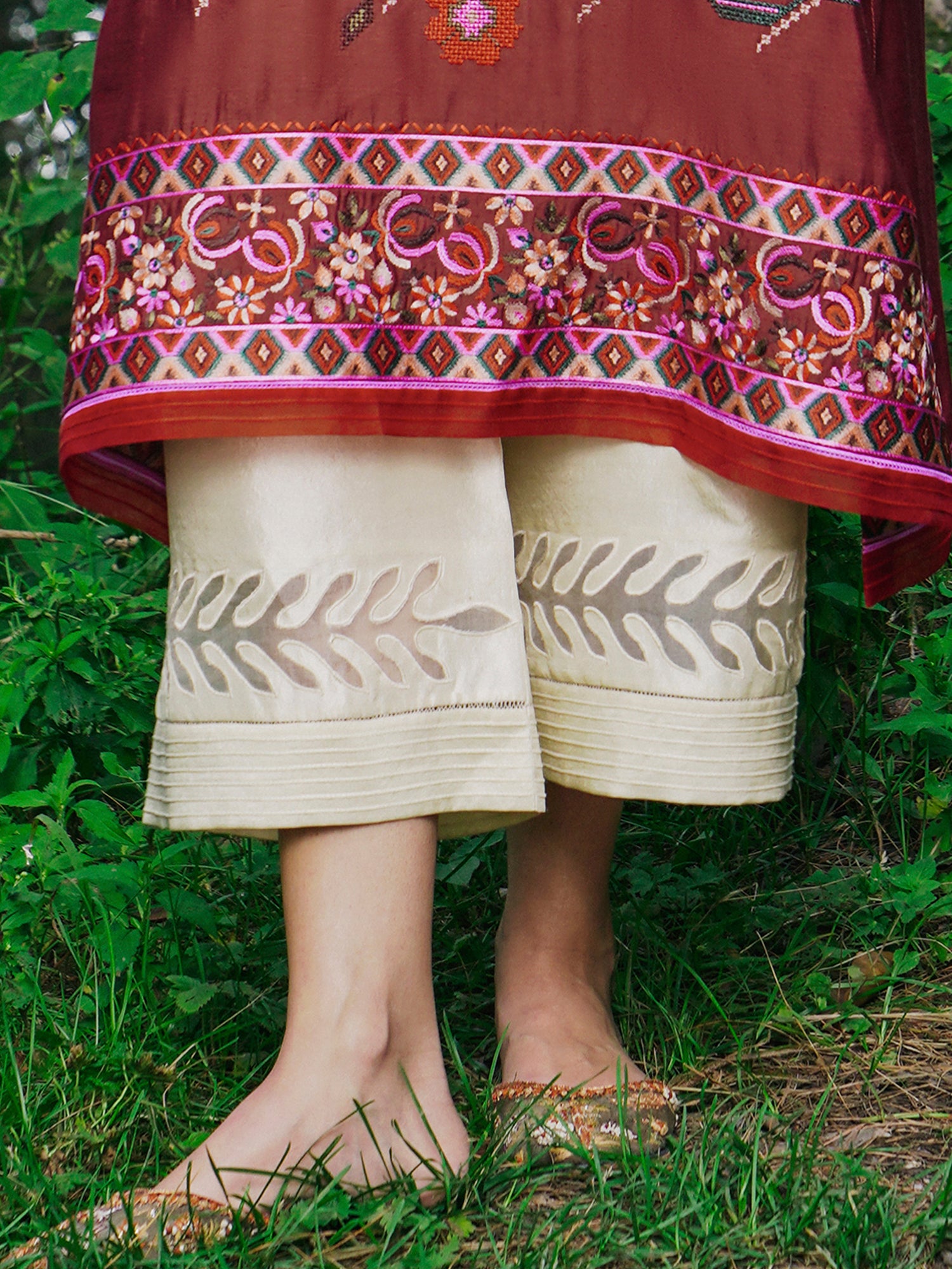 This crafted izaar will hold its shape even after hours of wear. Designed to sit high on the waist, this ivory izaar is detailed with applique accents. Misha likes styling it with neutral tunics and tops, alike.