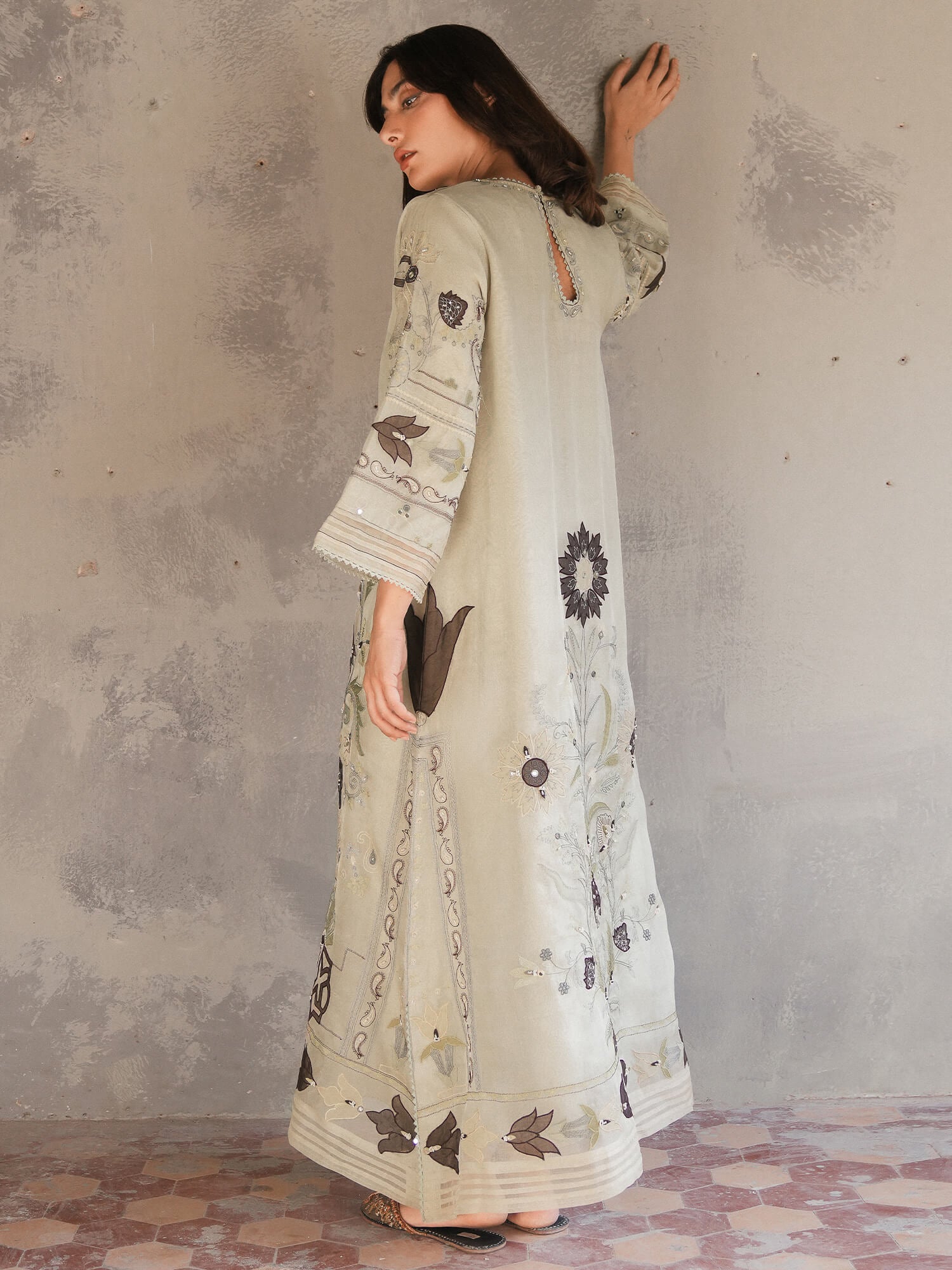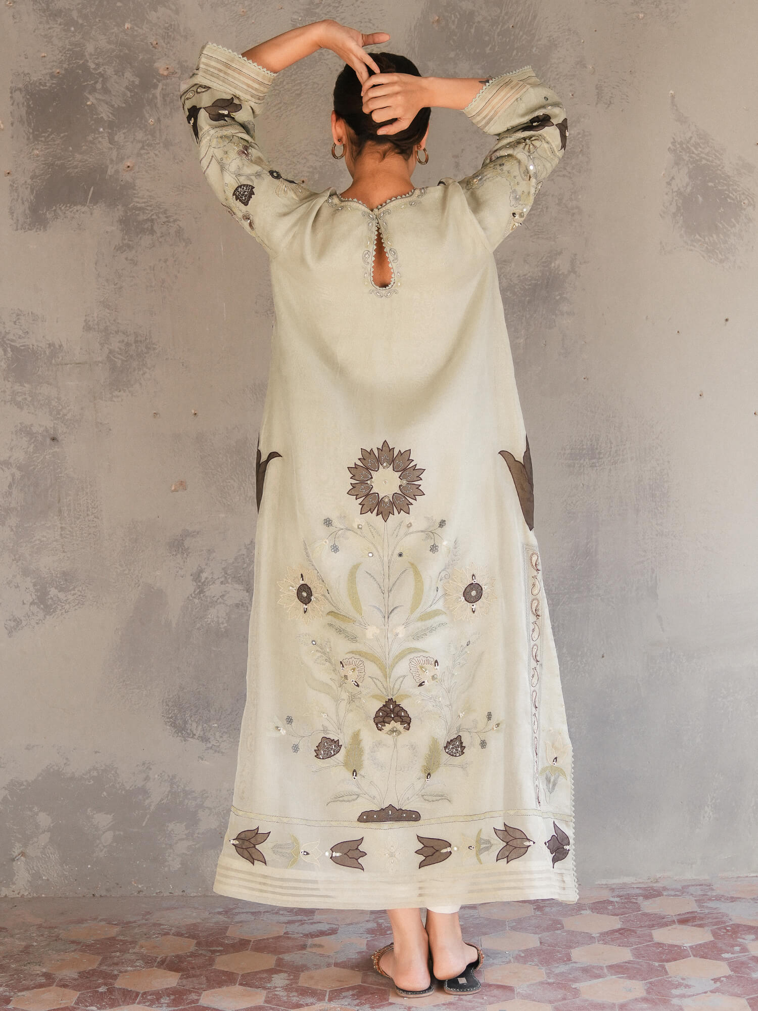 Cut from sage green organza, our Jalabiya features oak brown geometric floral applique with fine embroidered geometric imagery all over, with folk florals and minimal paisley work. This delightfully detailed piece can easily translate from day to night and can be worn for years to come.