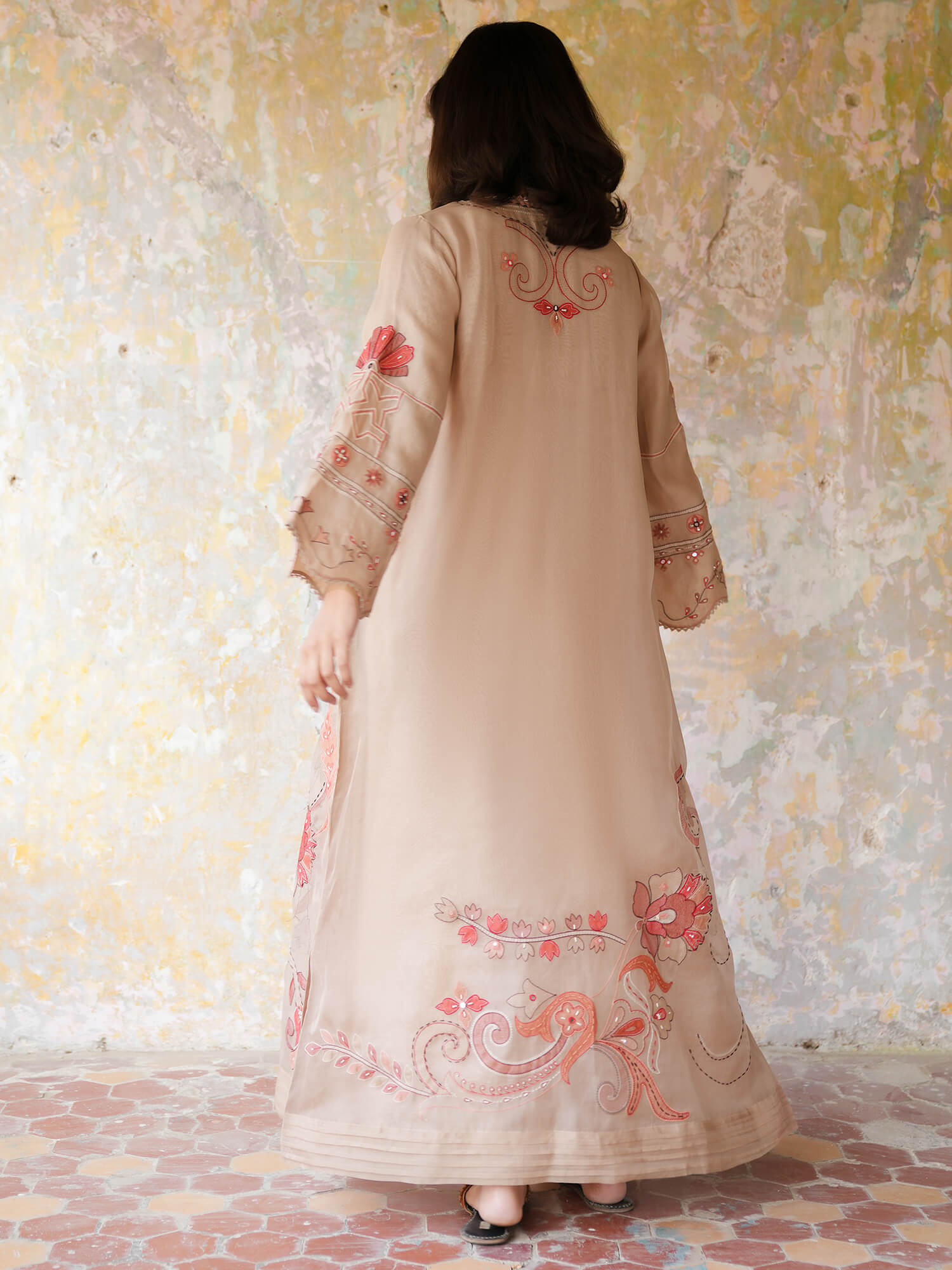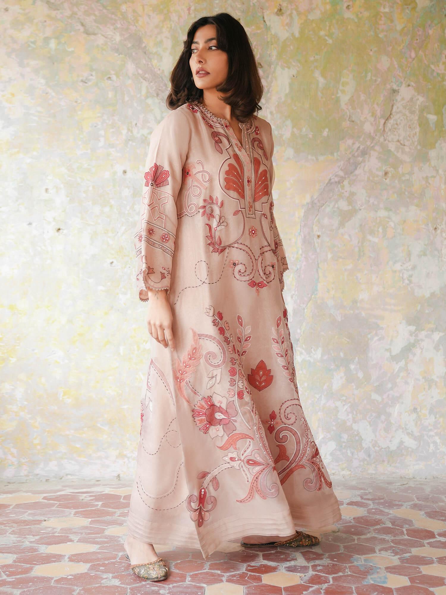 The Jalabiya transcends seasons and styles. Crafted form opal pink organza, it is adorned with fine embroidery in monochromatic hues of red and coral. It is thoughtfully scattered with chunky applique floral motifs and single aari accents, and is perfect for the festive season ahead.