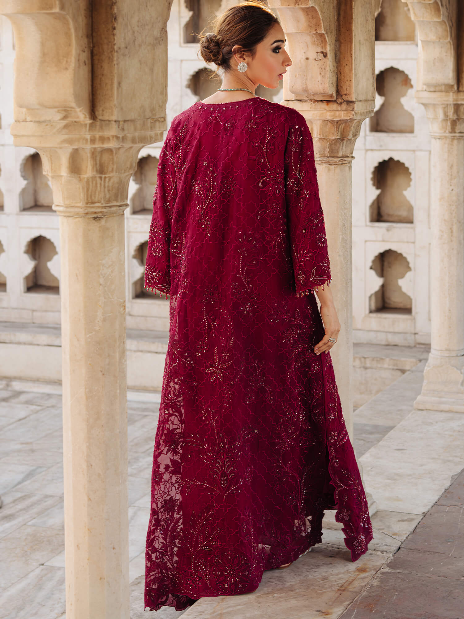 A dazzling combination of tradition and modernity, this statement bordeaux Jalabiya is tailored to perfection using organza and artfully embroidered with self on self-beaded work and applique. Perfect for moonlit occasions, this is the perfect addition to your festive wardrobe.