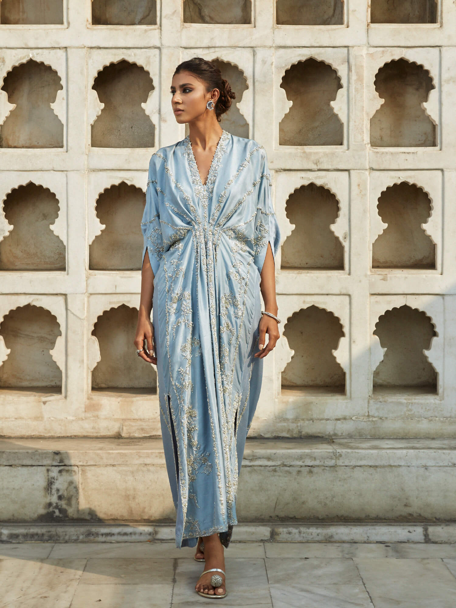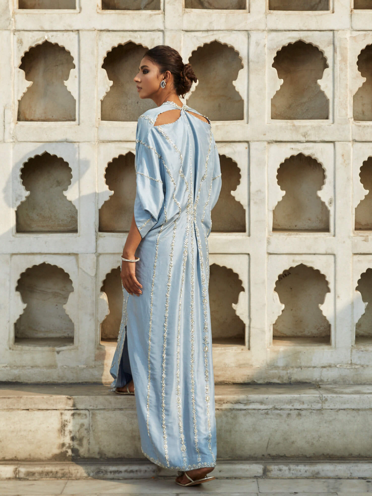 Our Kaftan is ideal for an evening edit; whether you’re going to a cocktail party or a wedding. Lavish and feminine, it's detailed with a sharp v-neckline, side slits, and cutouts on the upper back and can be worn for many festive occasions.