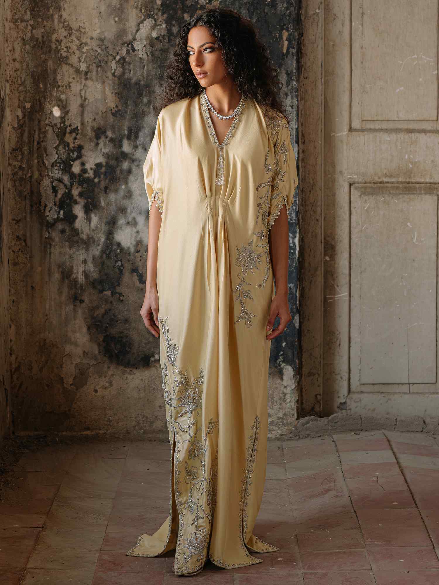 Misha Lakhani's S24 Kaftan has a free-spirited bohemian feel. Cut from raw silk and hand-embroidered by a skilled artisan with floral zardozi accents. Designed with a V neckline, side slits & cut-outs on the back.