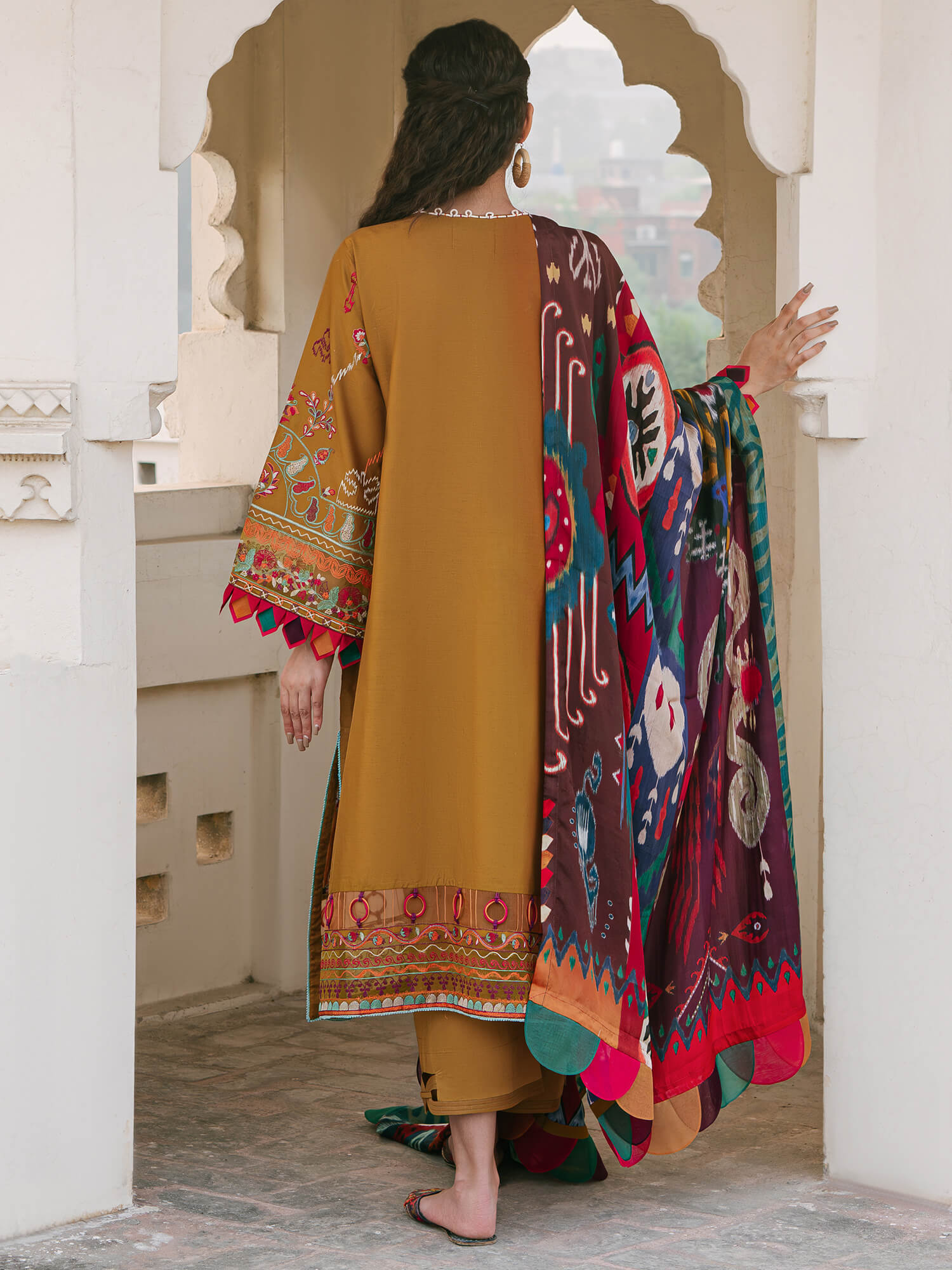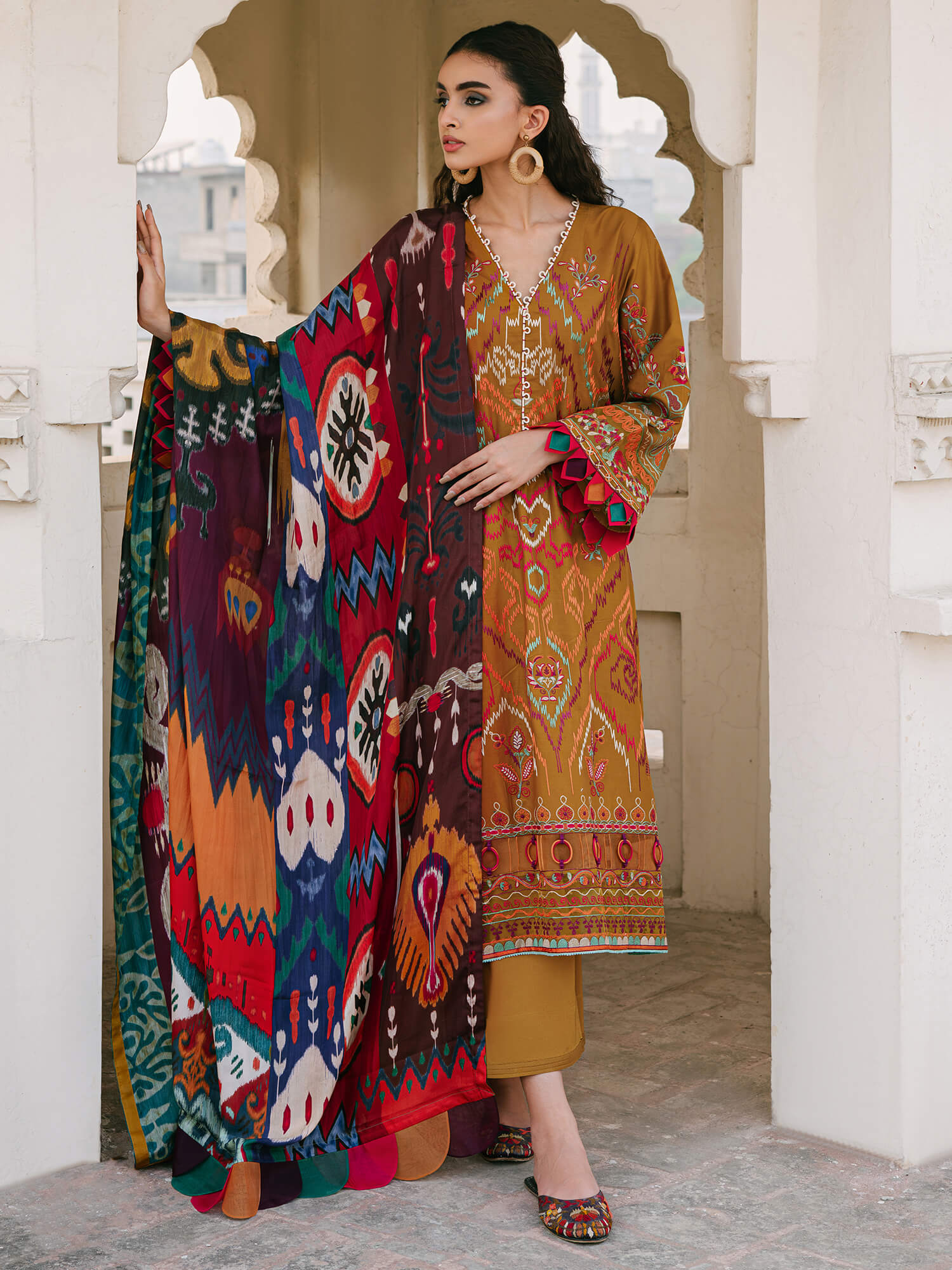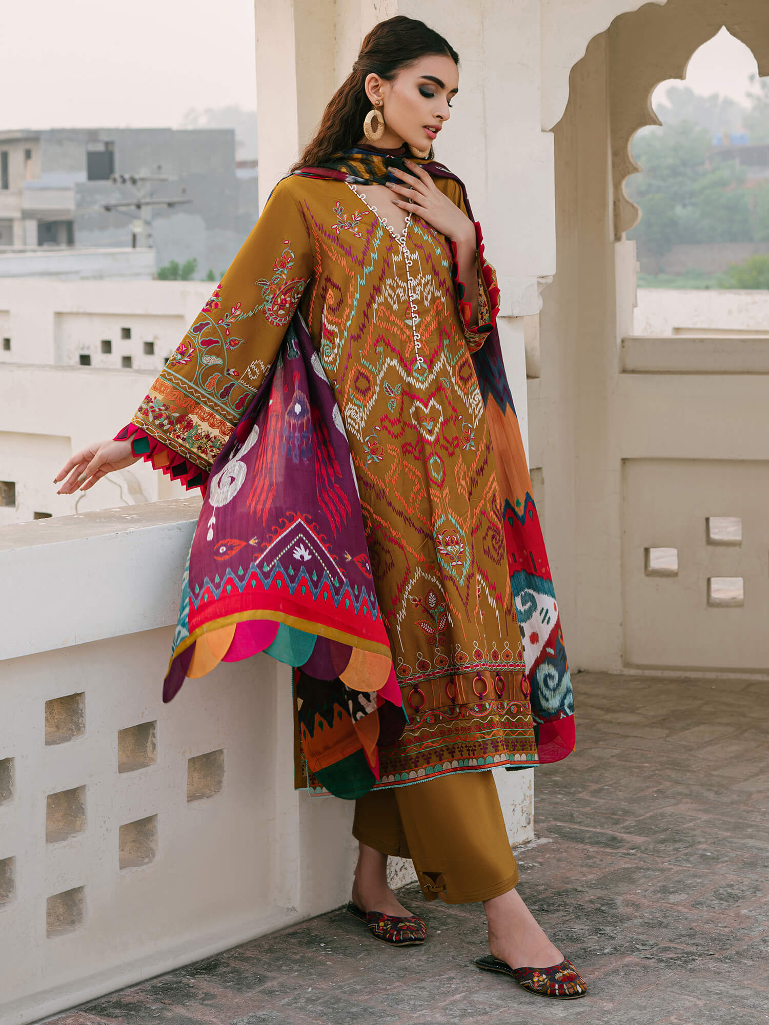 This saffron-hued “Mehr” is inspired by Ikat motifs and will be every collector’s dream; timeless and luxurious. It is paired with a pure medium silk dupatta featuring beautiful, hazy ikat elements.
