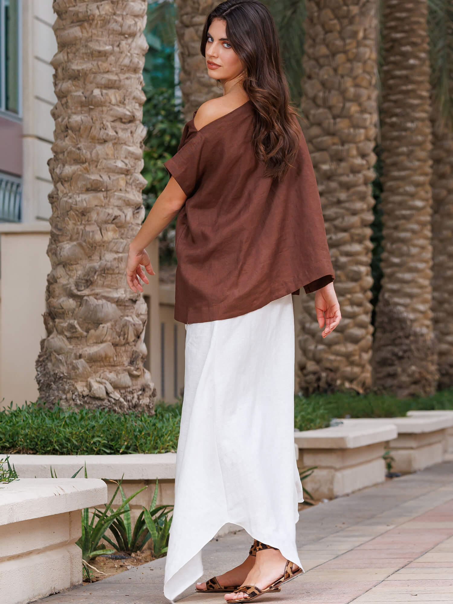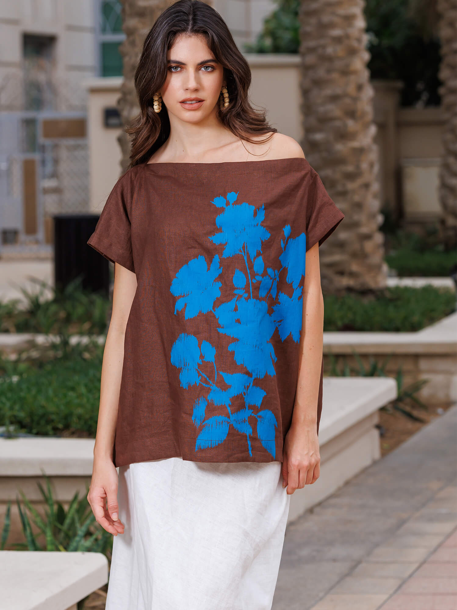 Summer ready silhouettes, perfect for the months ahead. Our chocolate brown off-shoulder linen top boasts a unique cerulean print to make a statement and can be styled in a myriad of ways. We like it best paired with our pinch skirt for a complete look.