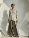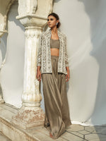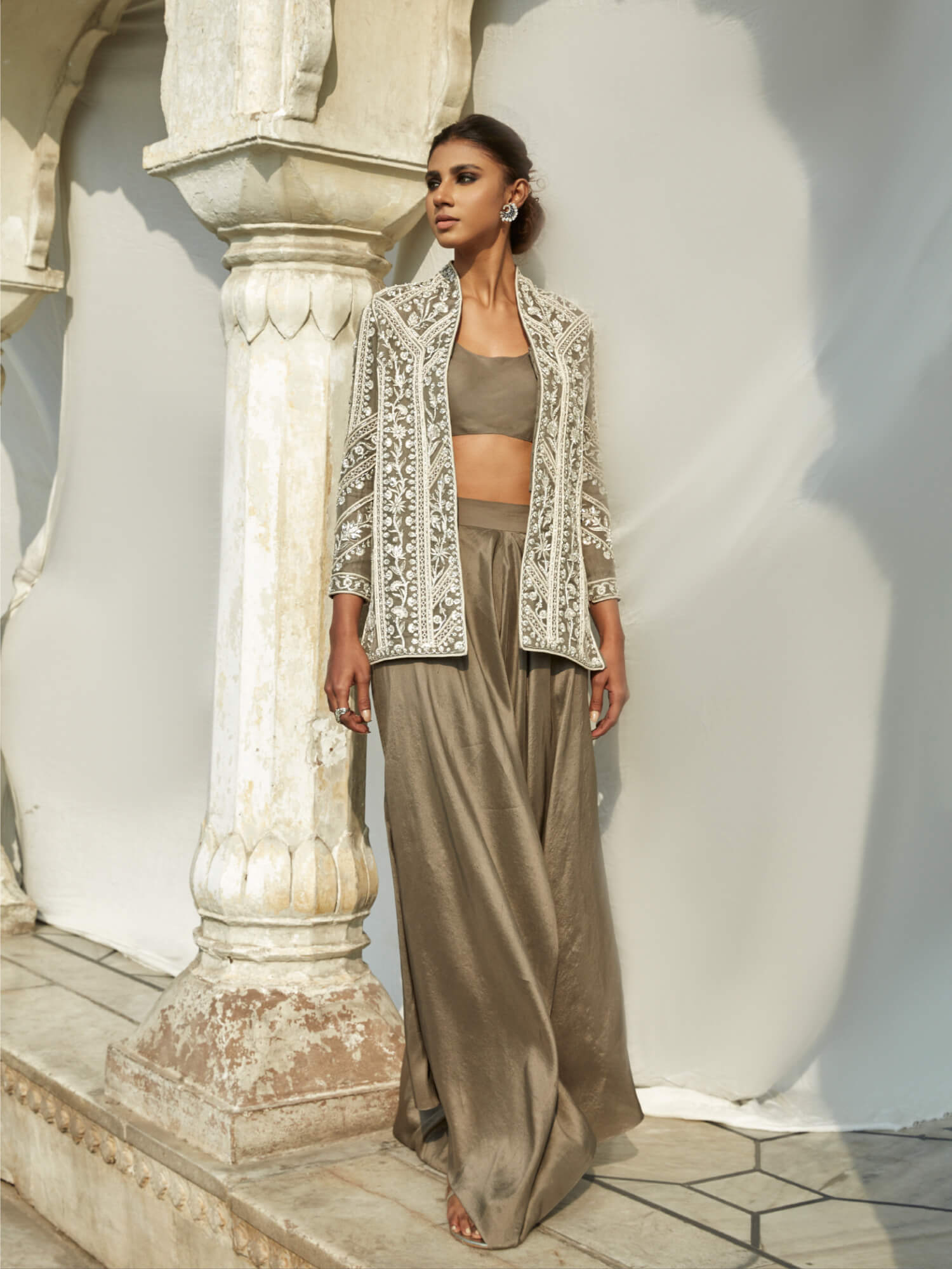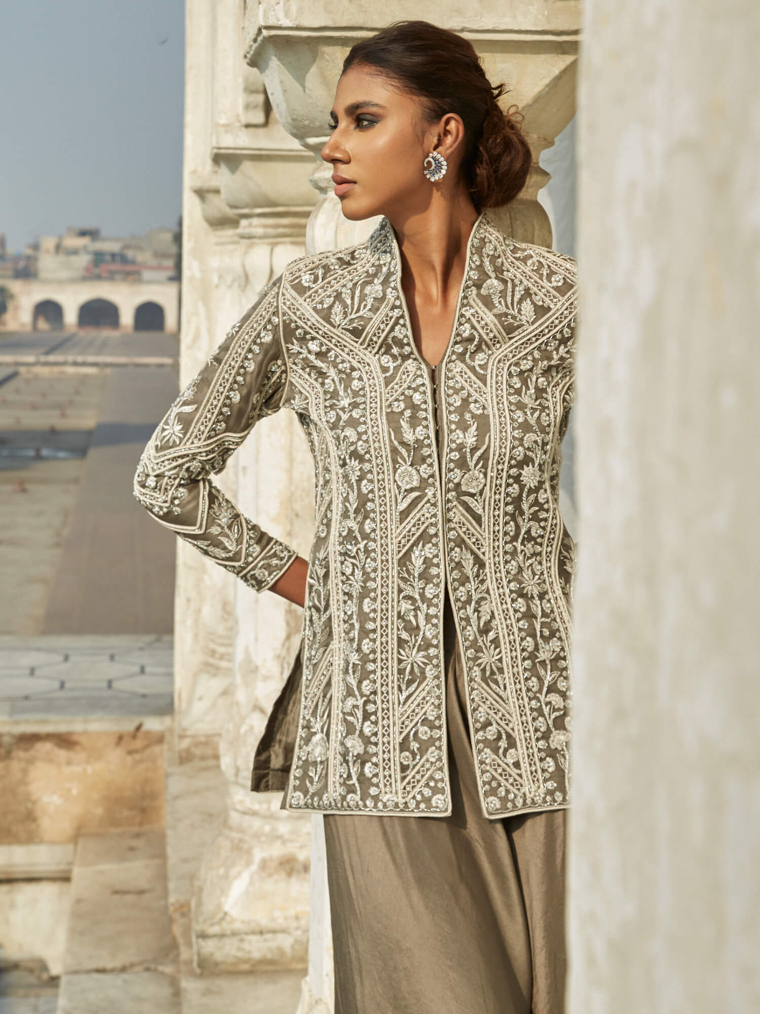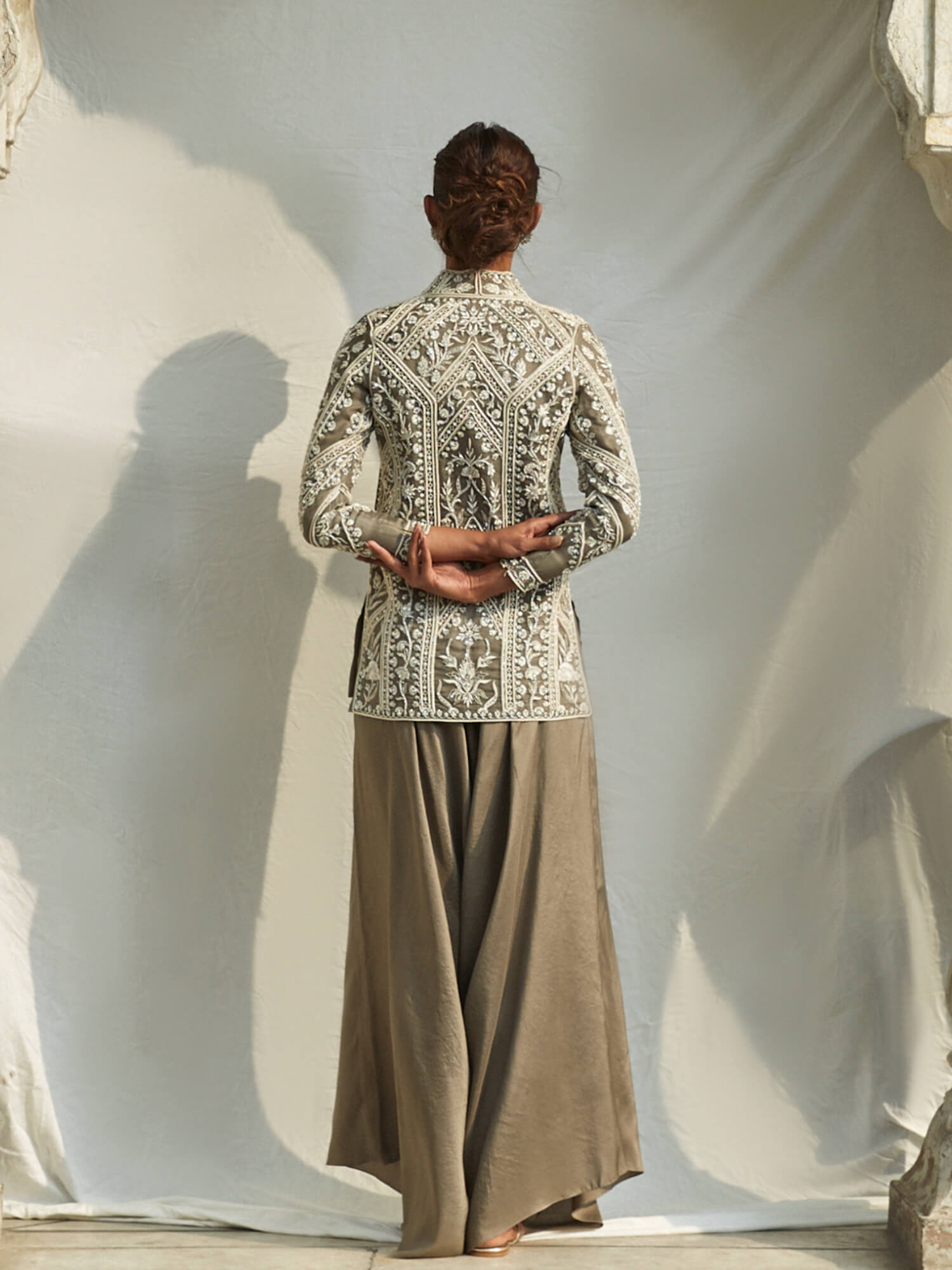 The Rani jacket from our Spring Couture Collection features floral and rope embroidery, finished with handcrafted accents. Styled here with loose pants for timeless elegance.