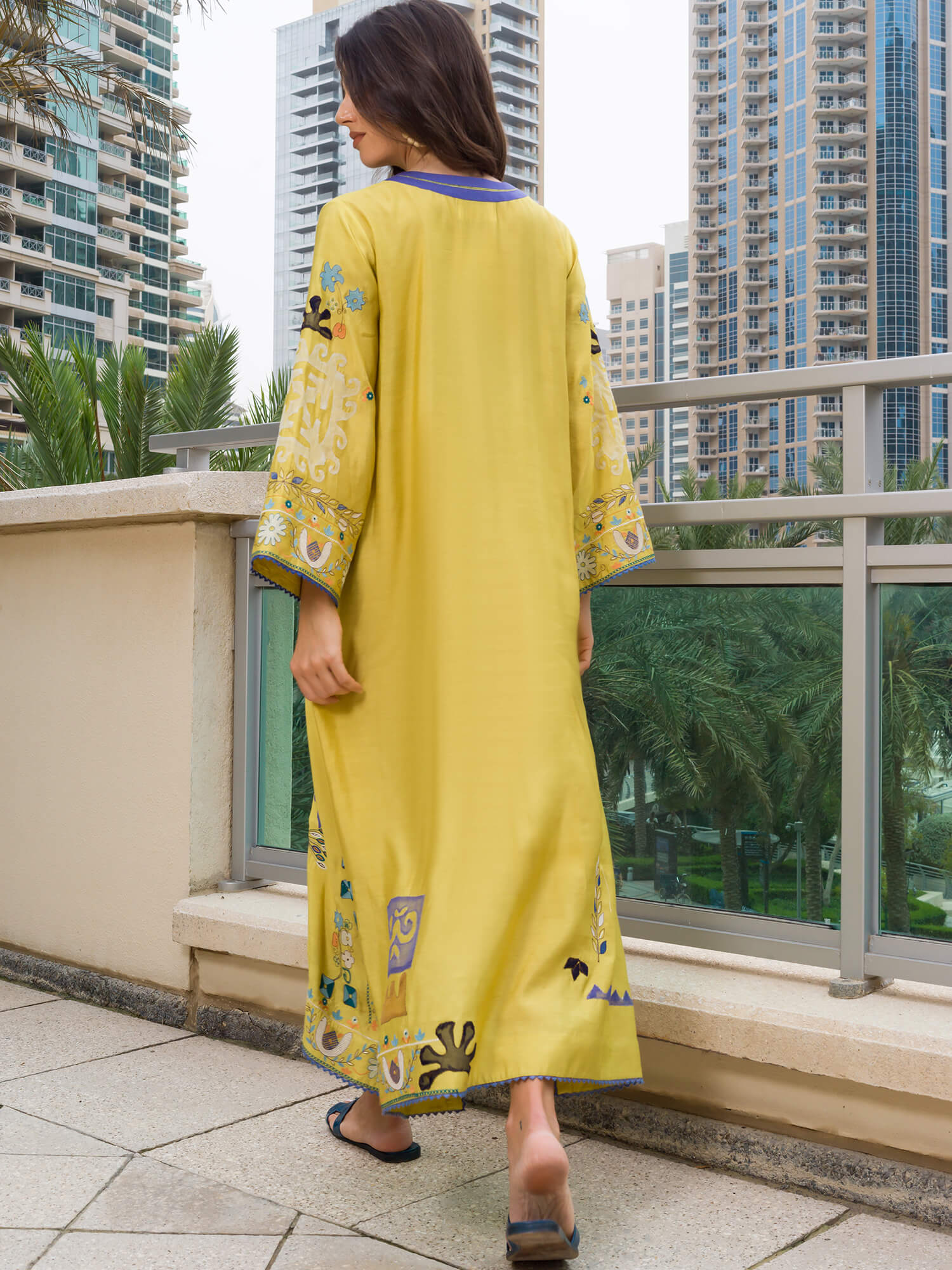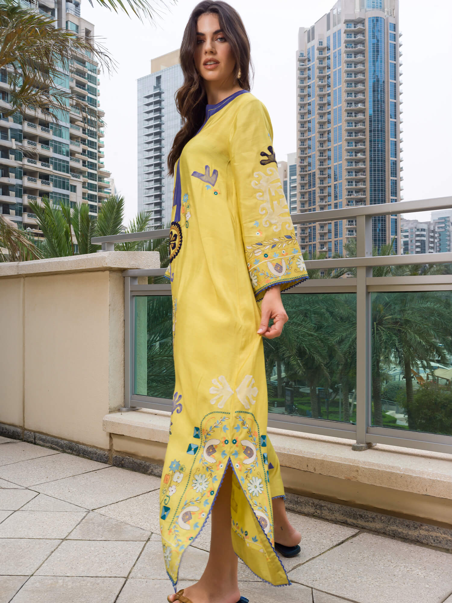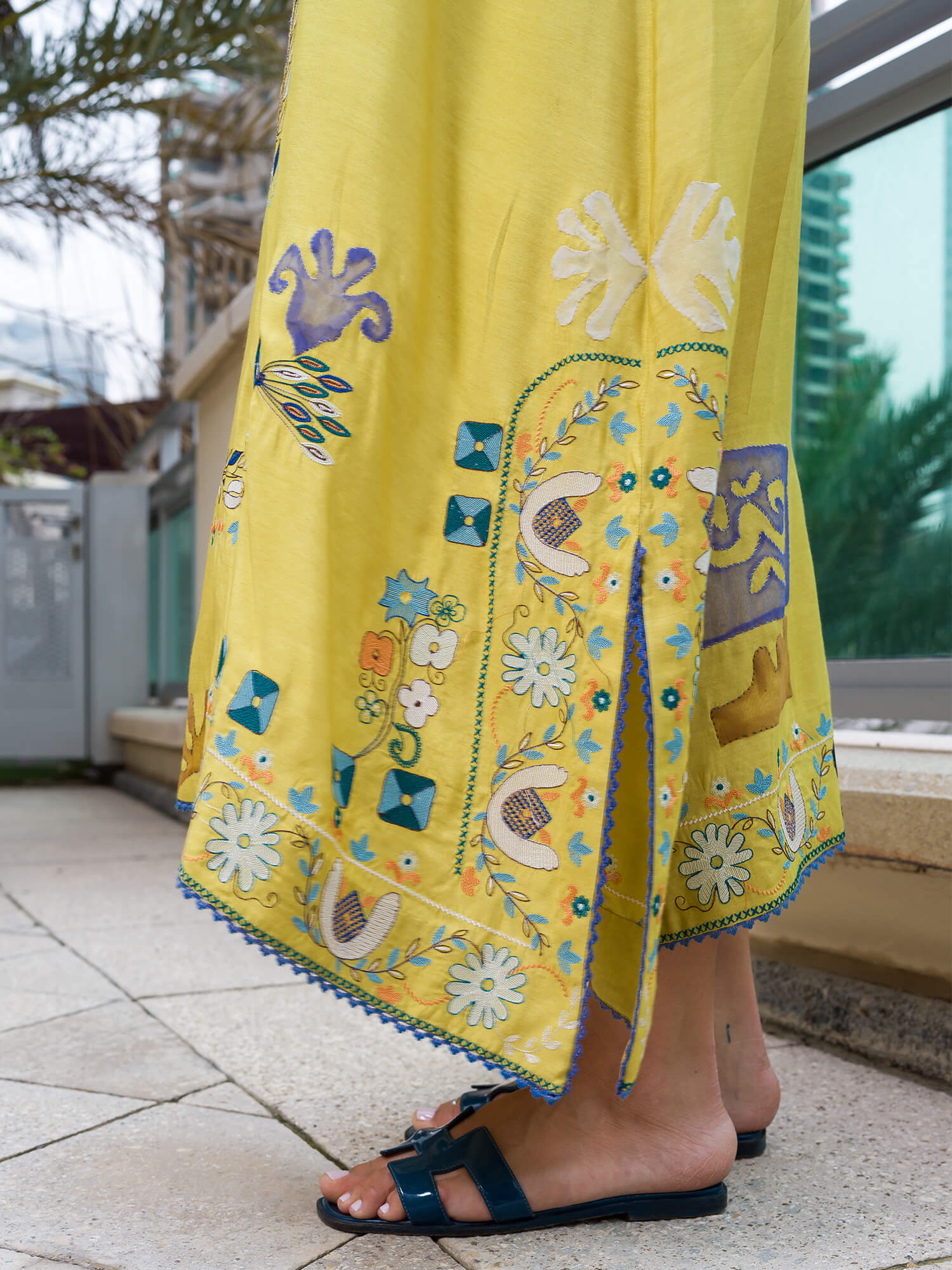 Crafted from cotton silk in butter yellow, the Sicily embodies both elegance and comfort. It features our signature artisanal craftsmanship and embroidered details in contrasting hues scattered all over, adding a touch of uniqueness. Ideal for summer day-time wear!