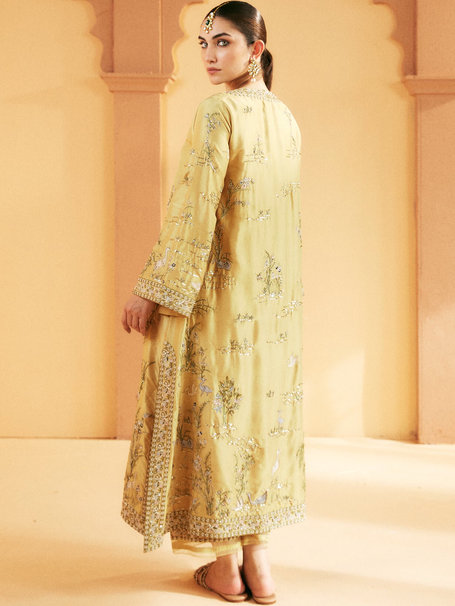 Inspired by gardens in bloom, our luxurious raw silk Sicily kurta is adorned by sophisticated gara and chintz floral motifs, intricate resham work, and scattered jewels. Paired with a matching izaar, this classic ensemble is sure to be cherished season after season.