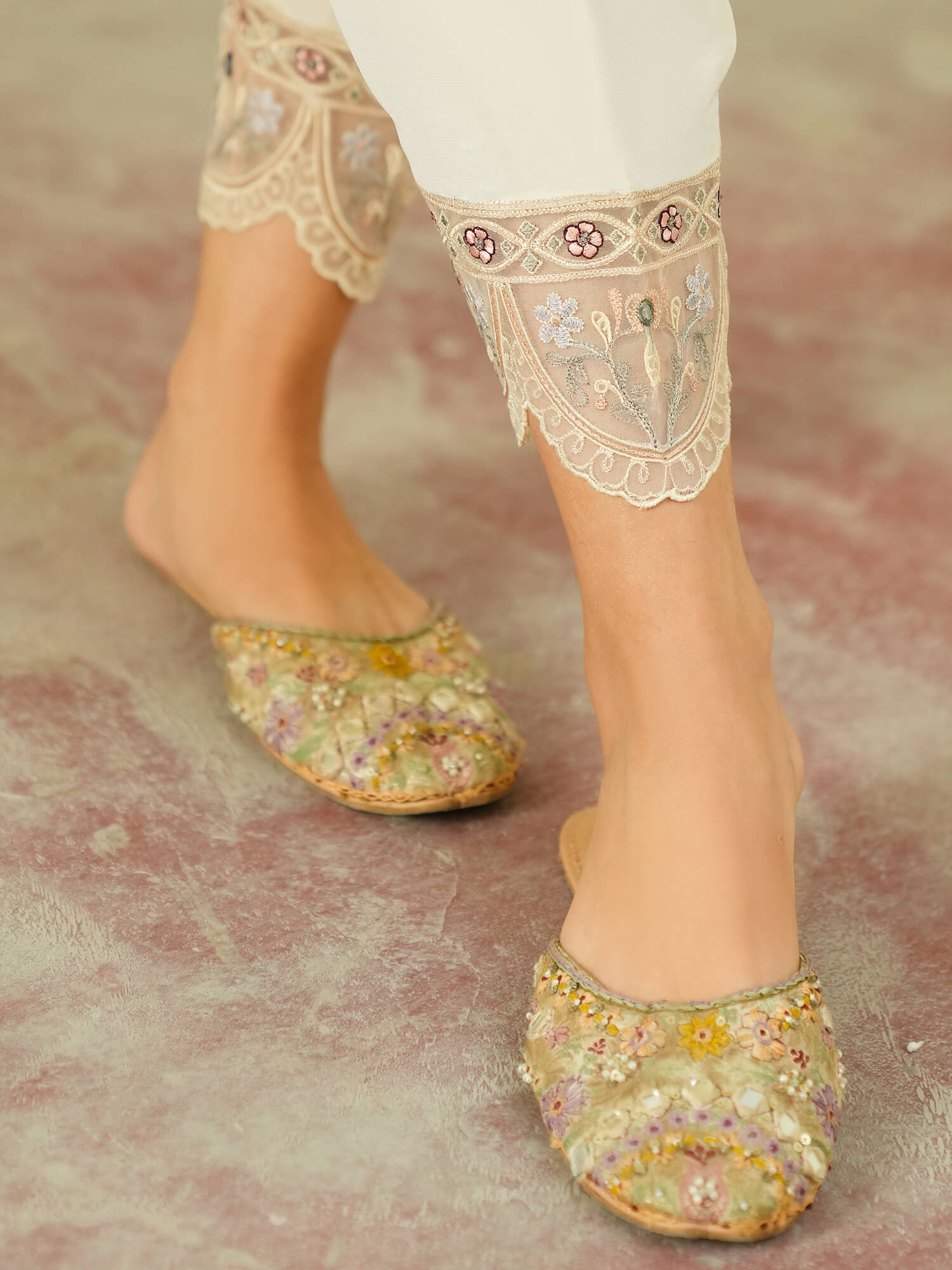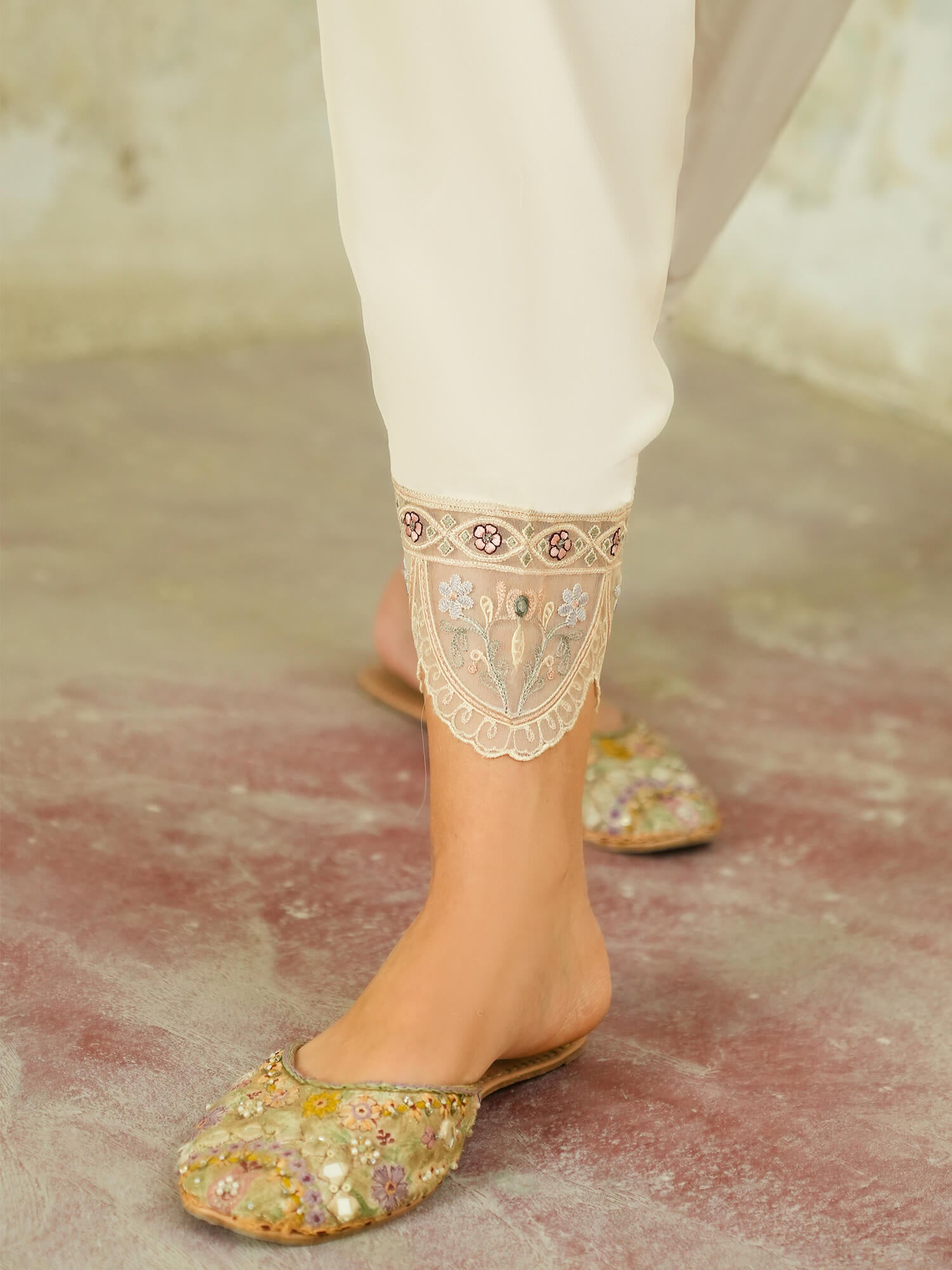 Our relaxed ivory skinny shalwar is crafted from crepe and is adorned with multi-hued aari embroidery inspired by Mughal florals on organza border around the ankle. It cuts a feminine shape and can be styled with various tunics and tops alike.