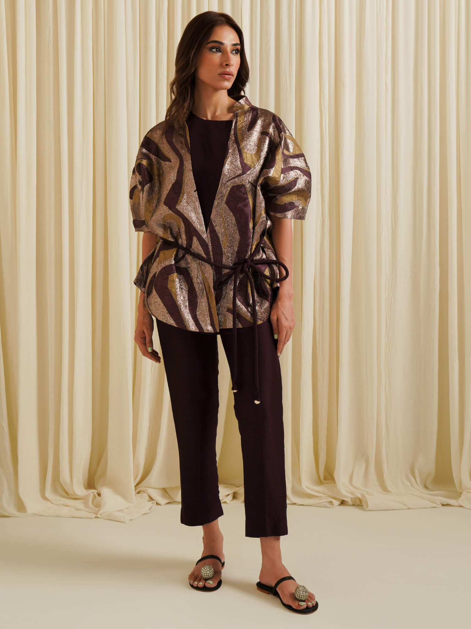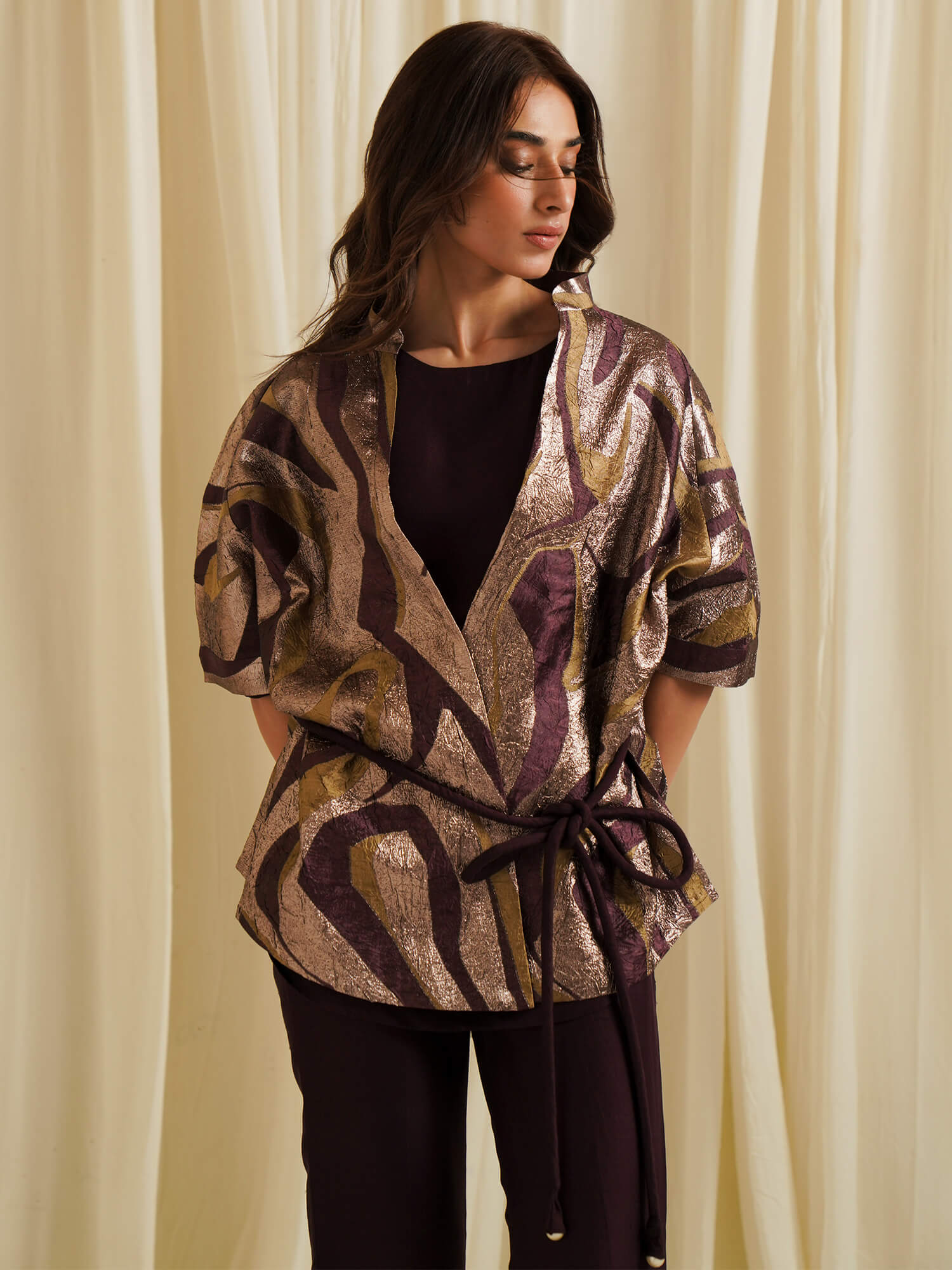 Our timeless Vince wrap is a versatile piece that effortlessly transitions from day to night. Crafted from a luxurious metallic textured fabric, it is paired with a flattering lily top inside and tapered pants in a rich aubergine hue. Whether belted or left open, this wrap exudes both elegance and glam.