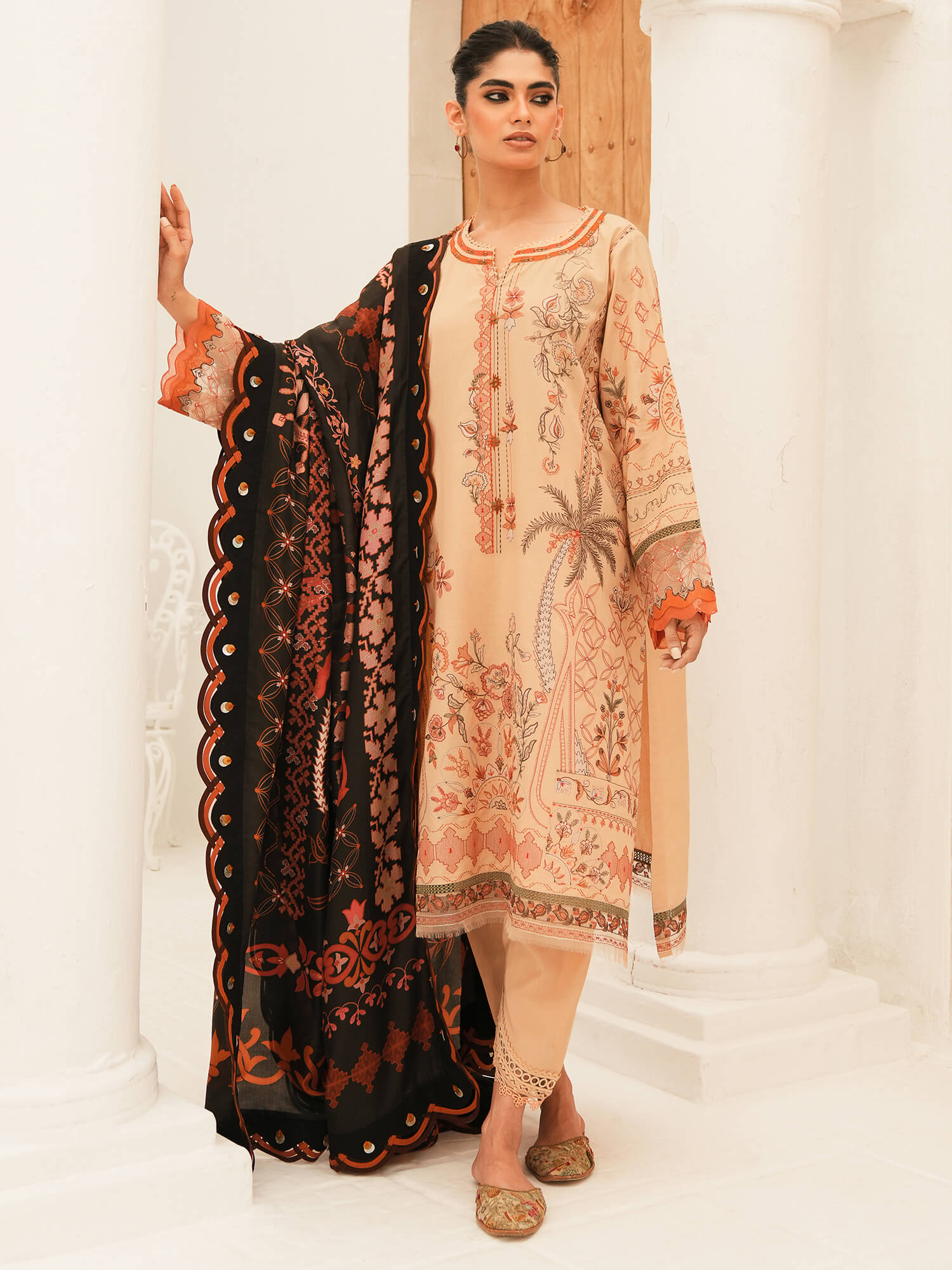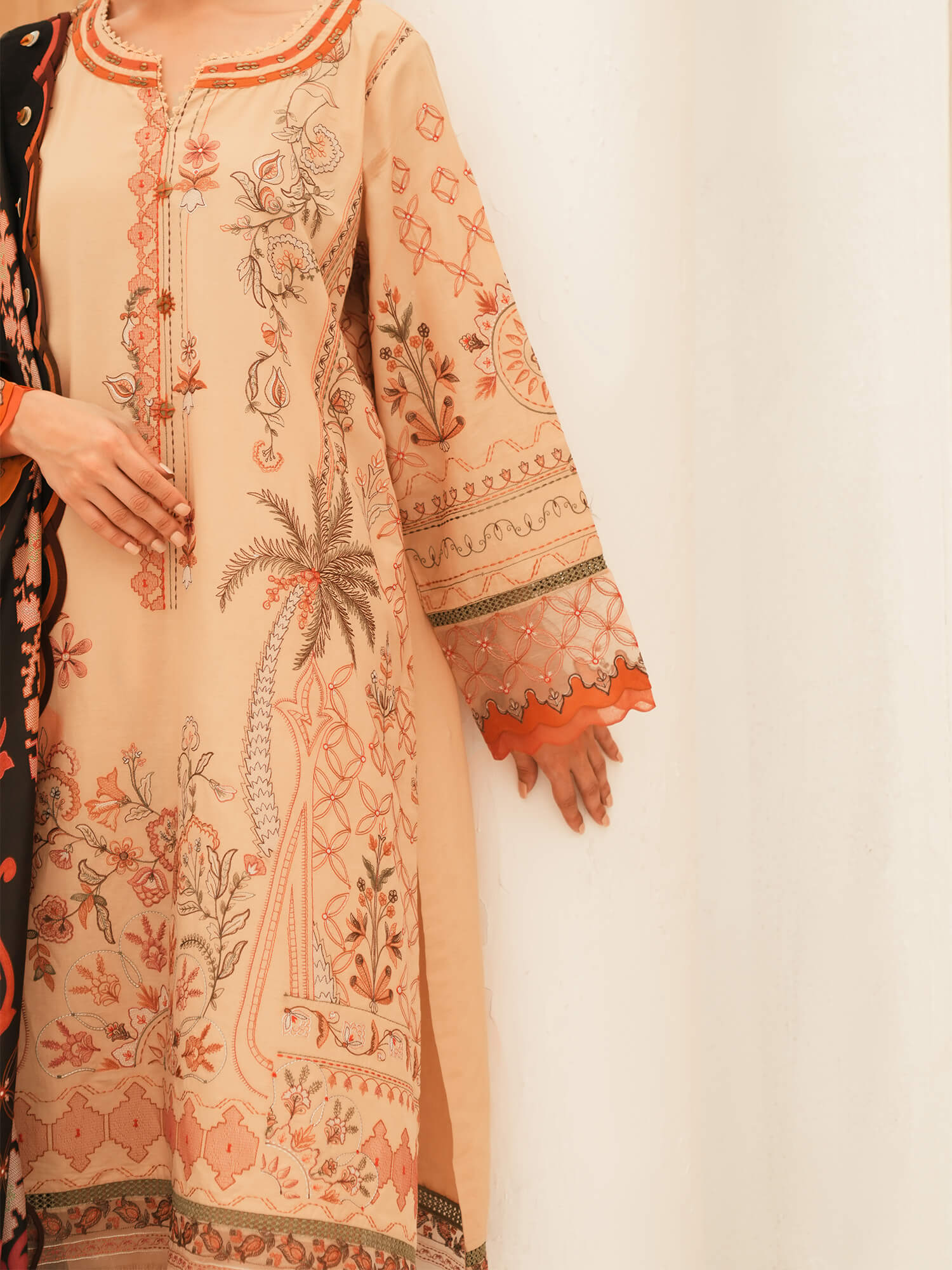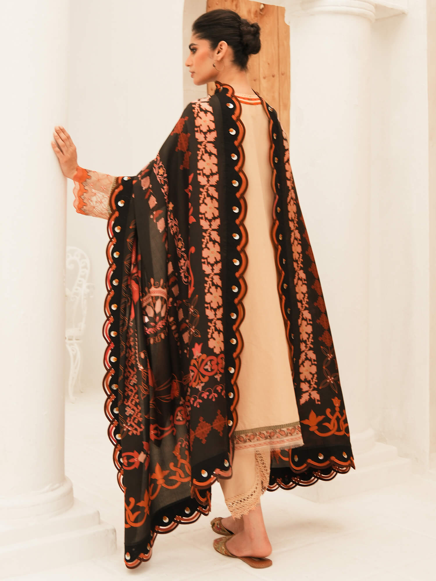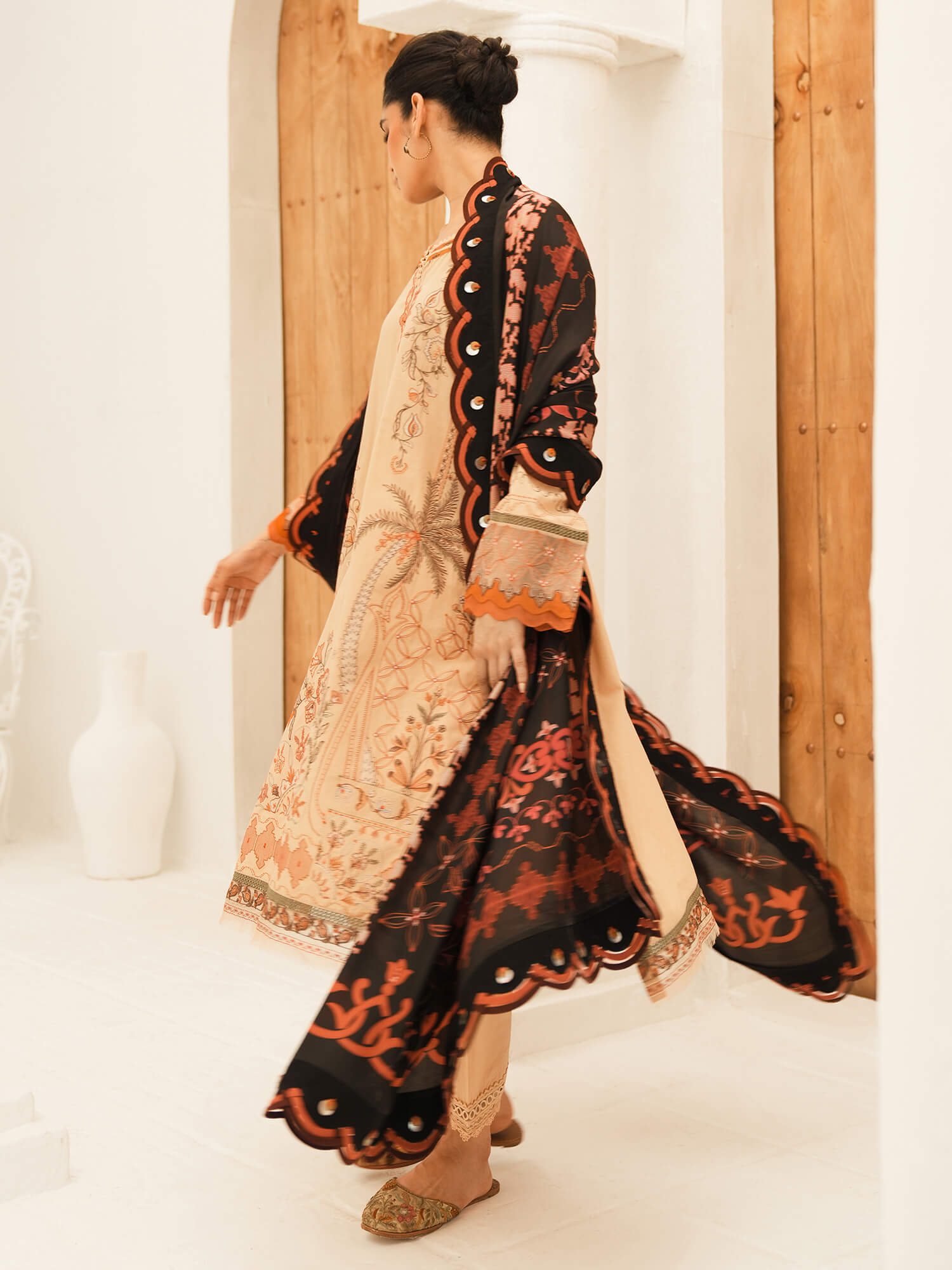 This peach-hued “Zoe” features a delicate embroidery set against a dramatic black silk dupatta enhancing chunky trellises and prominent palm tree, with matching pants.